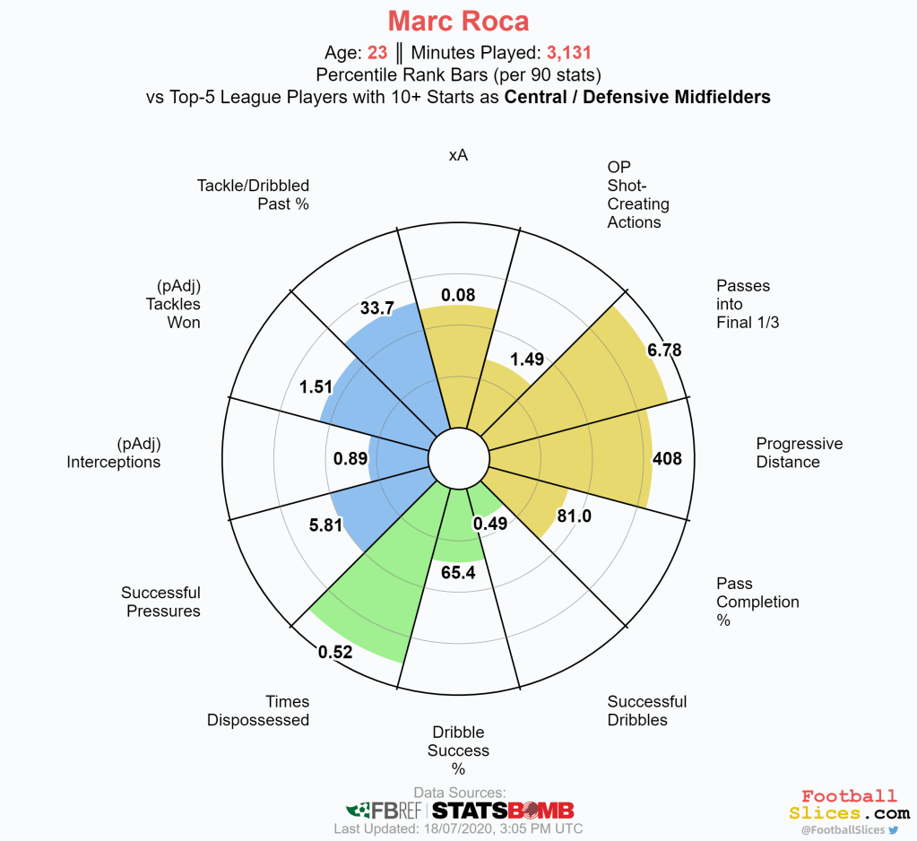 Roca is in the same mould as Dani Ceballos, but also more importantly carries the same influence as the Barcelona great, Sergio Busquets. As well as being elegant in possession, he can also provide much cover for his defenders and is very good in his defensive duels also.