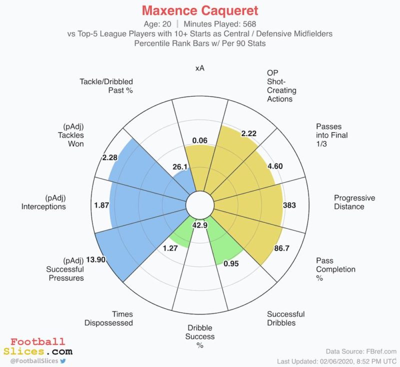 Caqueret averages the most middle third pressures out of anyone in the entire French Ligue 1 with only over 500 minutes under his belt.