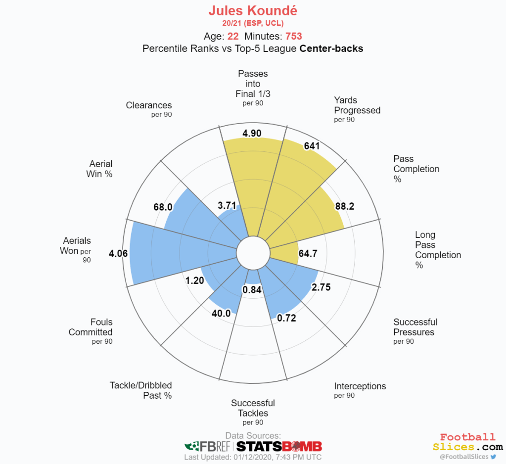 Another attribute that stands out in Koundé’s game, is his aerial prowess. Standing at 5’11, you wouldn’t expect to win most of his aerial duels, but he boasts an incredible leap and heading ability. Not only is he capable of sniffing out opponents and come out on top aerially but he even surprisingly has knack of beating the tallest forwards in the air. He wins on average 4.06 aerial duels which is already an improvement on last season (3.64). An impressive feat despite his height.
