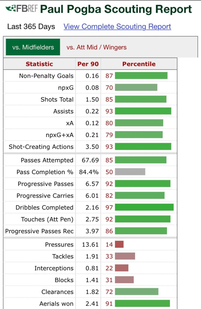 6.57 progressive passes, 6.01 progressive carries, 2.16 dribbles completed, 5.64 final third passes per 90minutes is truly indicative of the impact and the unique dimension that Pogba provides in United’s attacking play. He is delightful, especially when attempting those long-raking passes in order to dissect the tightest defences. His defensive contributions are as stark too: 1.91 tackles, 2.41 aerial duels won, 1.41 blocks, 0.81 interceptions and a staggering 13.61 attempted pressures shows Paul Pogba is the all-action, complete midfielder a club of Manchester United’s traditions and stature have daringly demanded.
