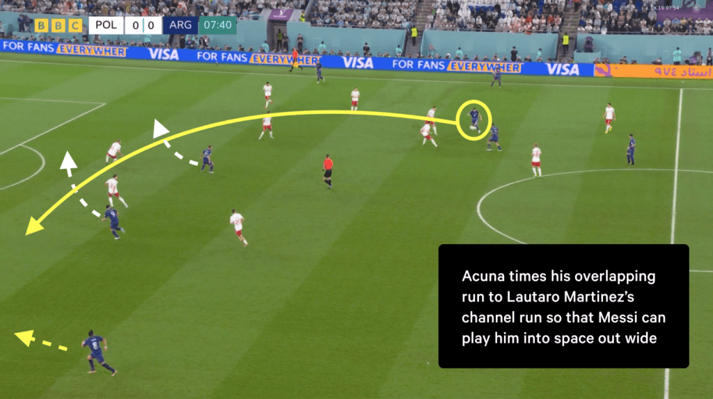 Another facet is stopping or tracking Marcos Acuna’s overlapping runs. Part of Messi’s trademark actions in the final third is him, picking up the ball in those right-half spaces and unleashing a delicious long-raking diagonal pass into the LB – Marcos Acuna’s – path as seen below , just like he did for Jordi Alba throughout their time together at Barcelona.