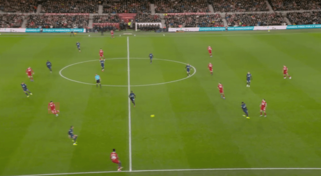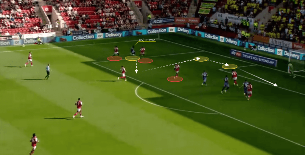 The defenders’ message to Whittaker is to try and beat them on the outside and that he does, delivering a delicious early low cross accurate enough to completely take the whole backline by surprise, which Azaz takes full advantage of.