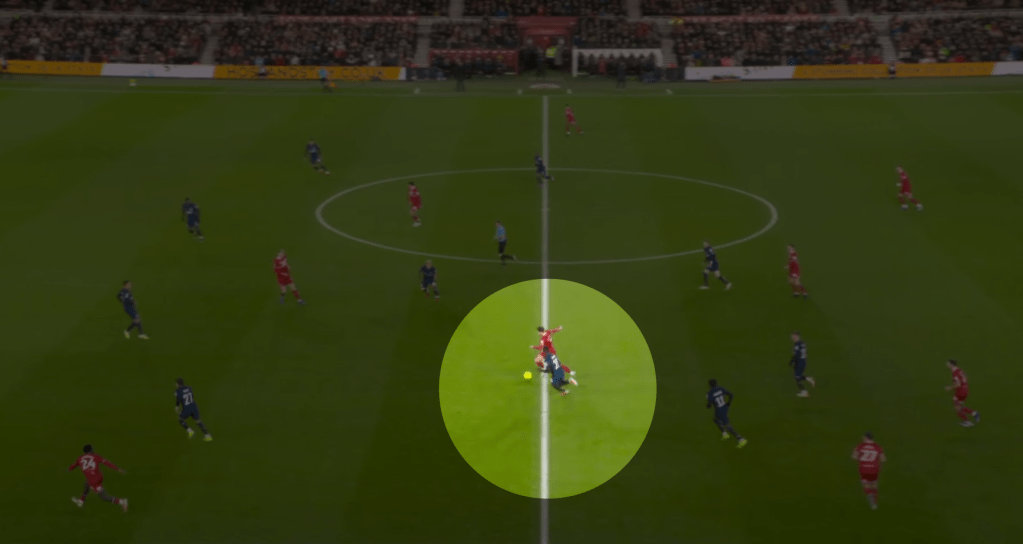 He also ranks in the low 27th percentile for tackles won per 90, and 34th percentile for tackles in the defensive third when Plymouth are in deep blocks and ranks in the 24th percentile for tackles in the attacking third per 90 meaning he doesn’t press with regularity even when the team are tasked with being aggressive in a mid-defensive block.
