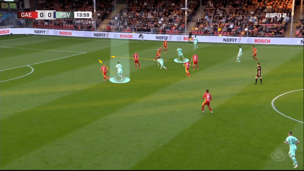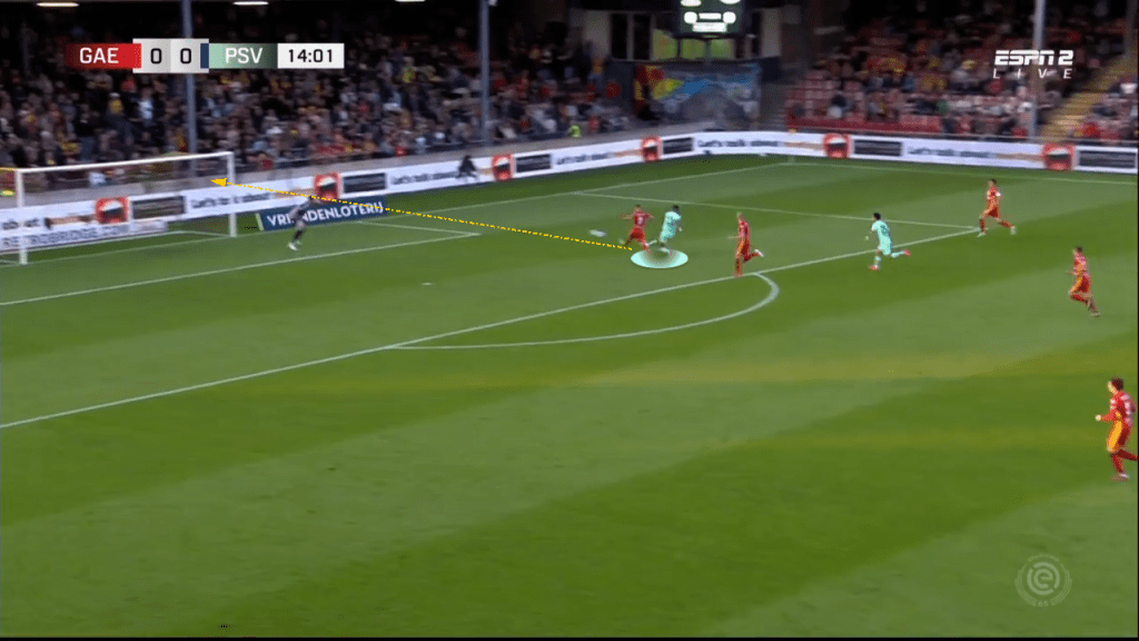 As stated previously Fernández is also an adept long-range passer, and he has carried that trait forward with Benfica, as shown in the clip below, picking up possession and expertly spreading the play into space for the full-back.