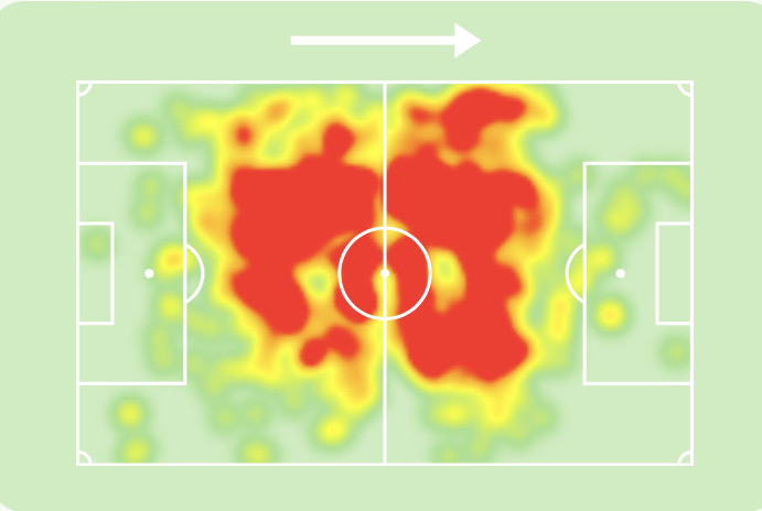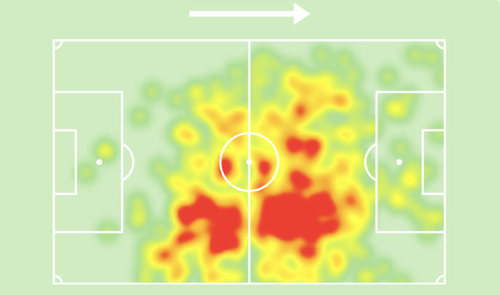In such a role, the 21-year-old was tasked, at the right-hand-side of a three man midfield (as shown in the below heatmap) to be the side’s main creative hub, but not deterring from his defensive responsibilities coming back towards his own goal, or winning the ball high up the pitch.