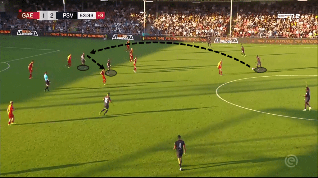 Frimpong is also adept at linking up with the inverted winger in the setup (Moussa Diaby), and that particular avenue is used as another tool for Leverkusen in attacking scenarios.