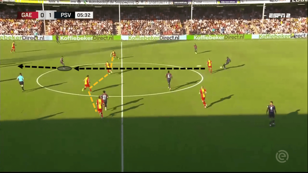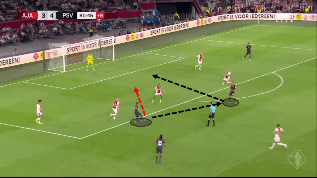 The 22-year-old’s explosive and electric qualities are most effective when taking on defenders in isolated 1v1s in wide areas. He holds the running power to consistently get to the byline, evading his direct markers before putting crosses in, a trait you’d expect from a player of his qualities. Though, the Dutch youngster’s game goes beyond that. He is superb at swiftly changing direction with deceptive movement, excellent body feints and tremendous ball control. Through those characteristics, he’s able to evade any sort of obstacle, even with two or three markers to contend with. In some instances, he will stop the ball dead under his feet for a moment before swiftly knocking it on past the defender with tremendous burst of pace and speed.