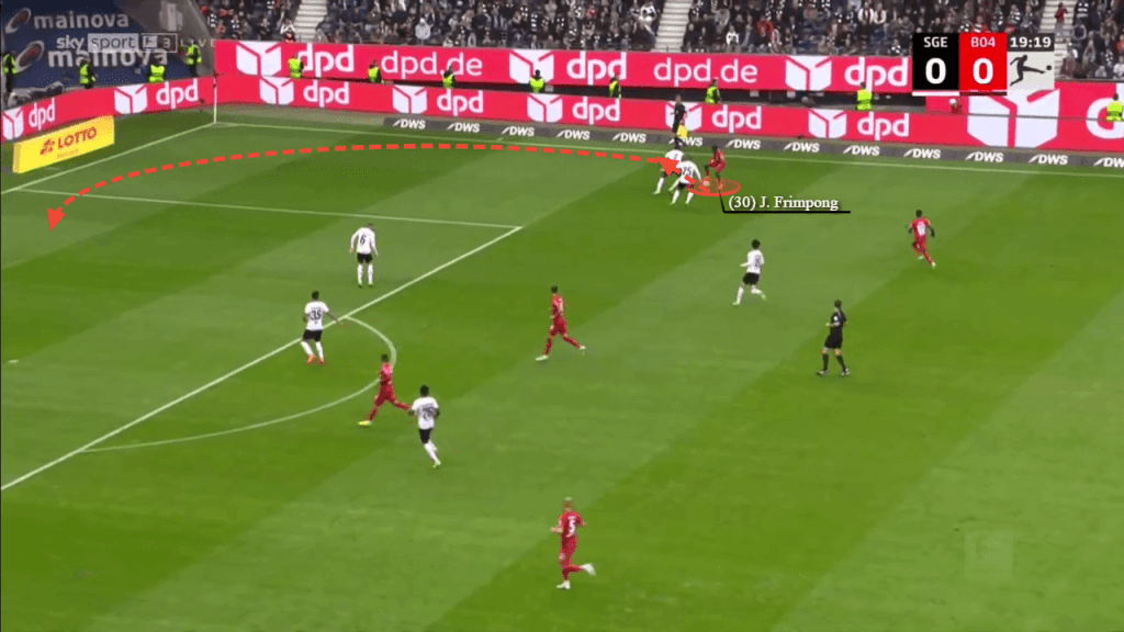 In the opposition half, Frimpong can press high and intercept passes during the build-up while also tackling defenders in 1v1 situations, or when he counter-presses. However, one of the main reasons why he may be seen as a wing-back for Leverkusen rather than a pure right-back in a 4-man defence may not only stem from the team’s weakness from that system, but his smaller physical frame that could be exposed in aerial duels.