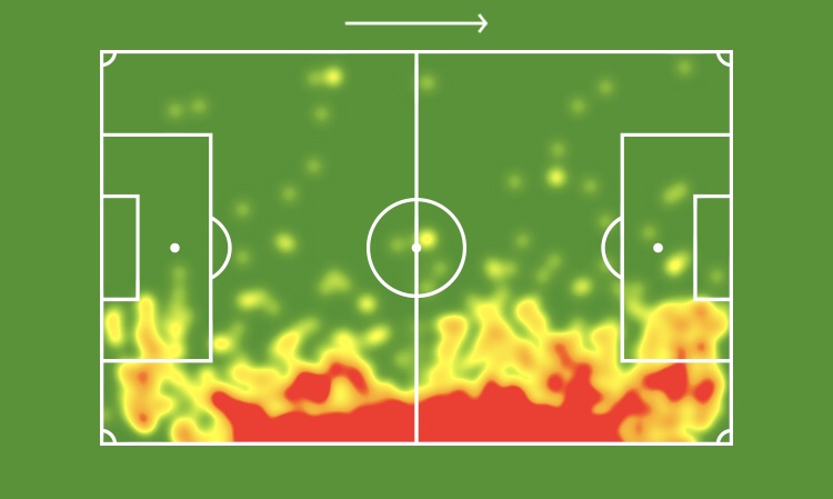 As shown in the above heatmap, Frimpong spends more time in the opposing half than his own, making things clear that he is a crucial and influential outlet in Leverkusen’s chance creation. It’s very rare you see defenders in the opposing half, but the way football has evolved in modern age, full-backs are a prominent feature in most team’s attacking play, and Frimpong’s attacking qualities are such that it is better to utilise him within the final third.