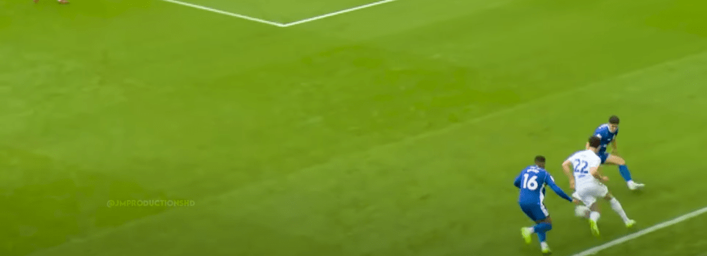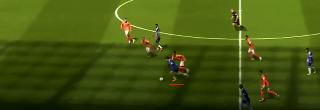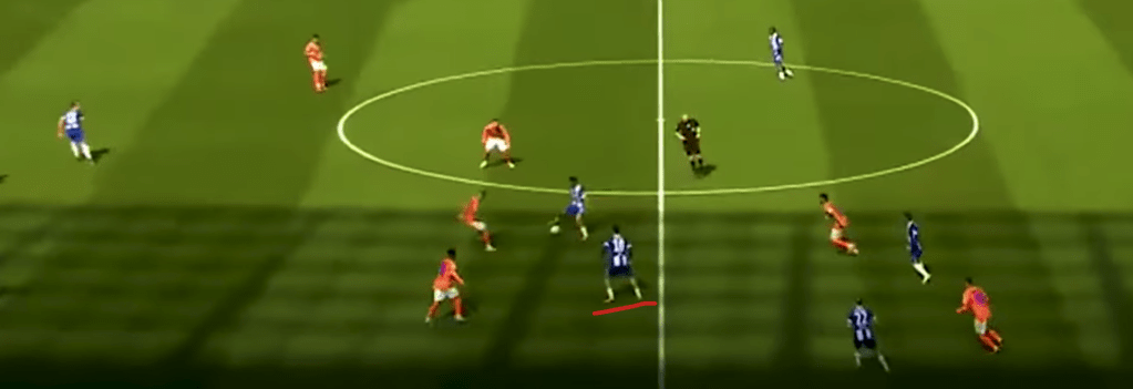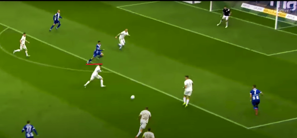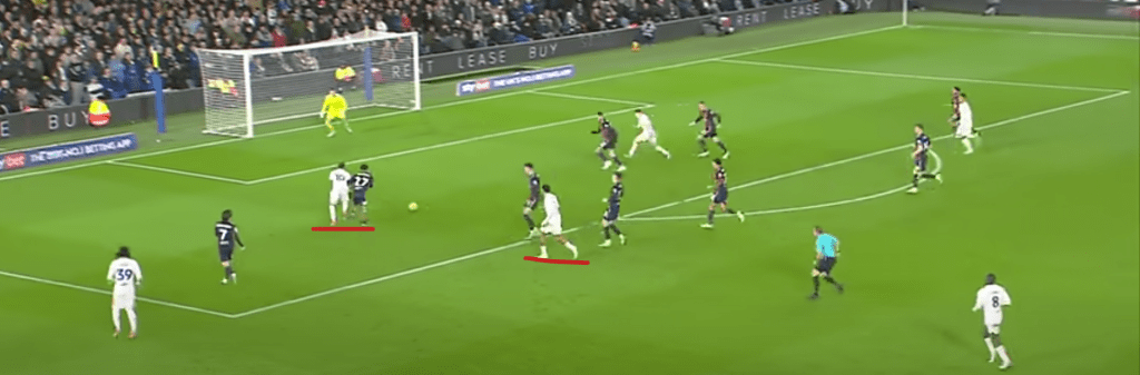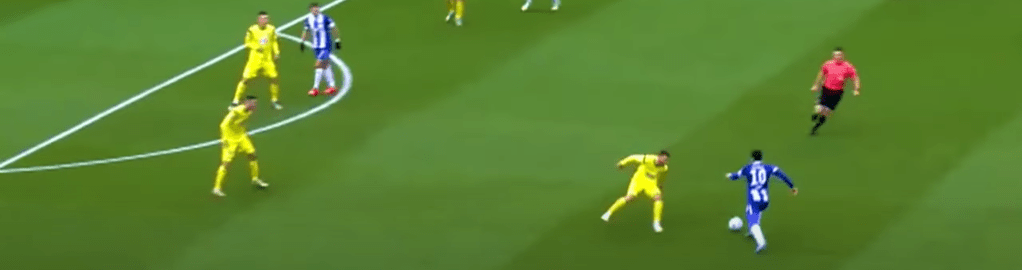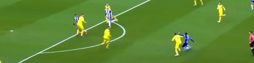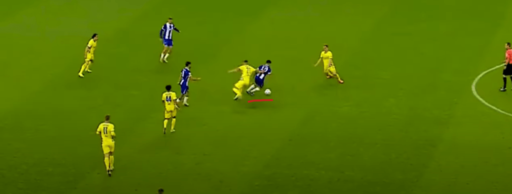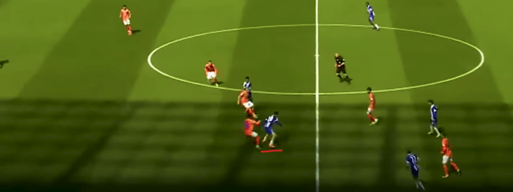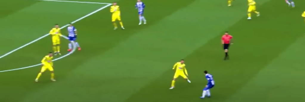 For instance, in the image below, we see Fernandez-Pardo picking up the ball wide, but in a pretty awkward position, with his back to goal and the angle to beat his marker looking extremely difficult…
