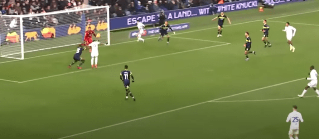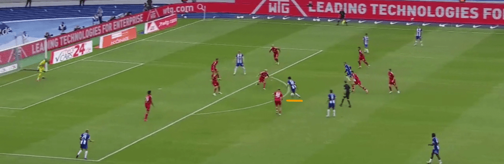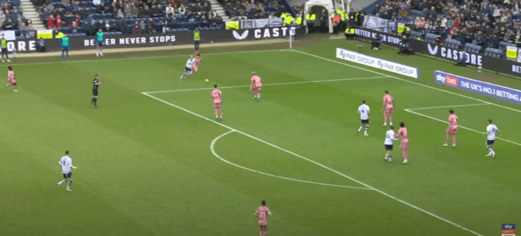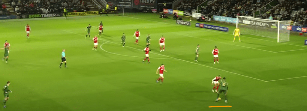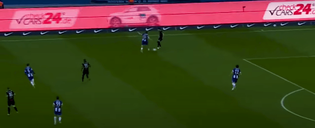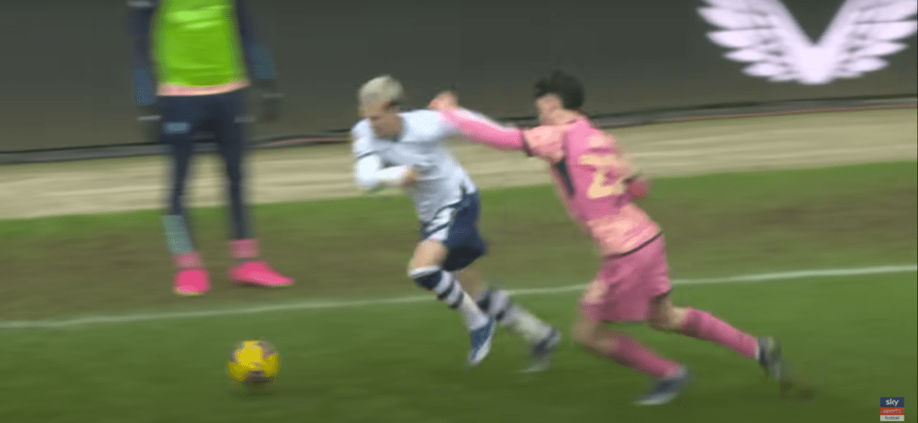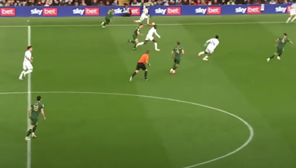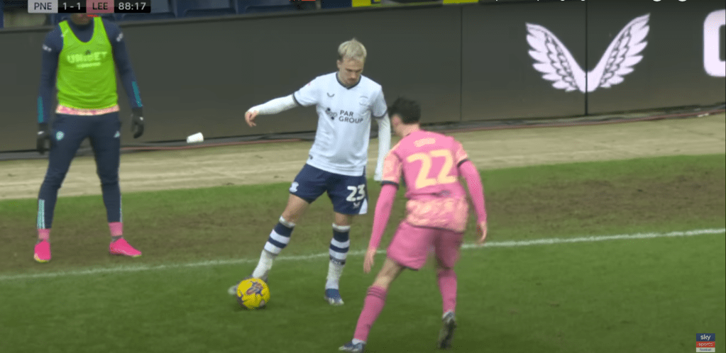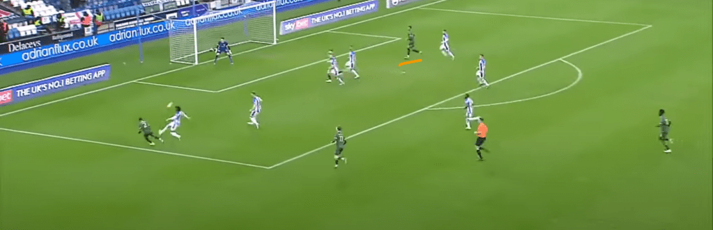 For instance, in the image below, we see Fernandez-Pardo picking up the ball wide, but in a pretty awkward position, with his back to goal and the angle to beat his marker looking extremely difficult…