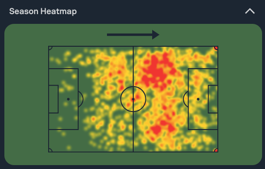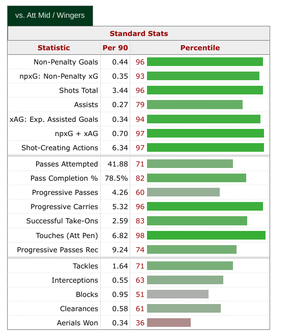 The data certainly backs this up: he completes a healthy number of successful take-ons and progressive dribbles per 90, ranking in the 79th percentile of wingers for progressive passes per 90.
