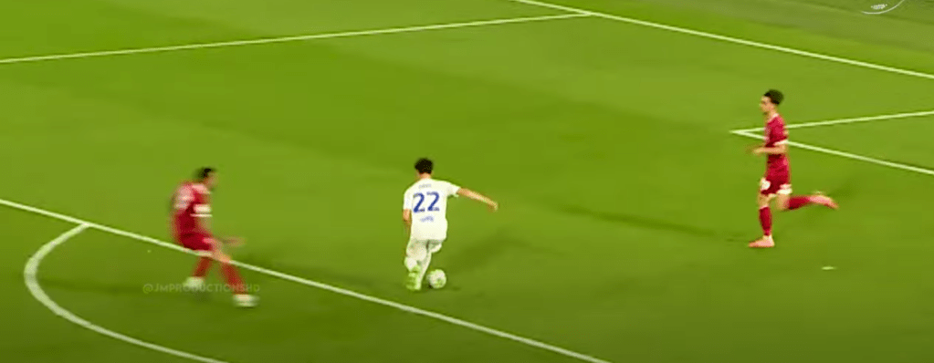 The first thing he does, however, picking up the ball and driving into such a position, is just as impressive, and once again highlights the kind of talent Fernandez-Pardo is. He doesn’t mind picking up the ball centrally, where he’s under most pressure when receiving.