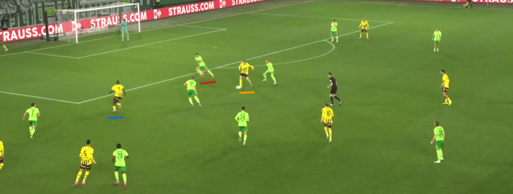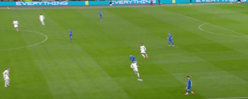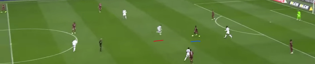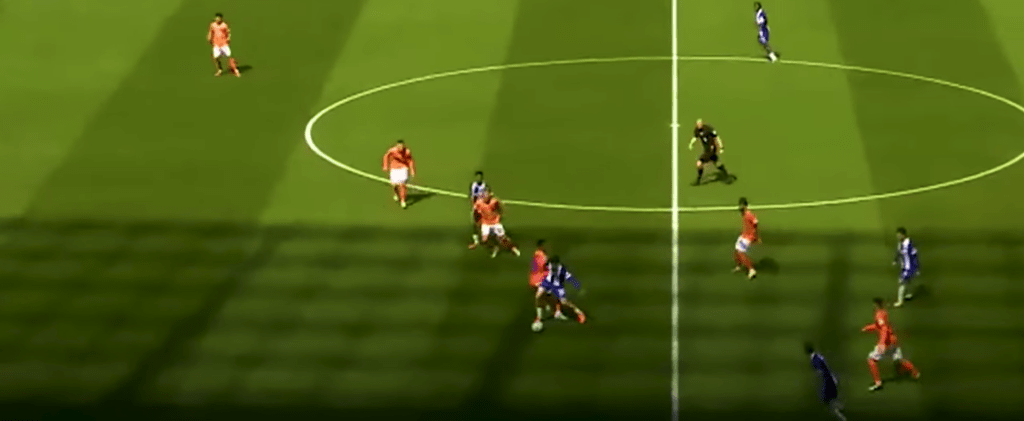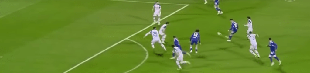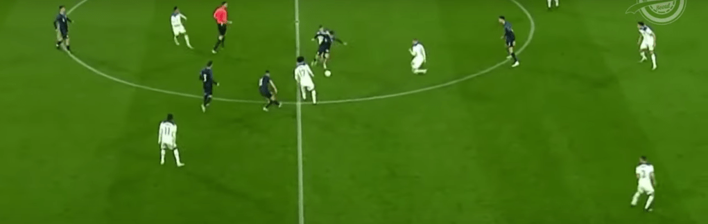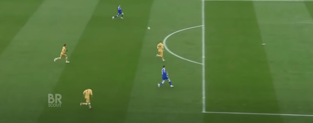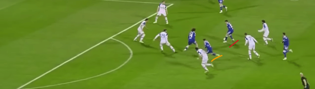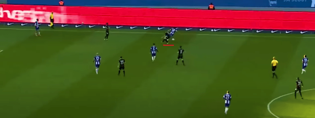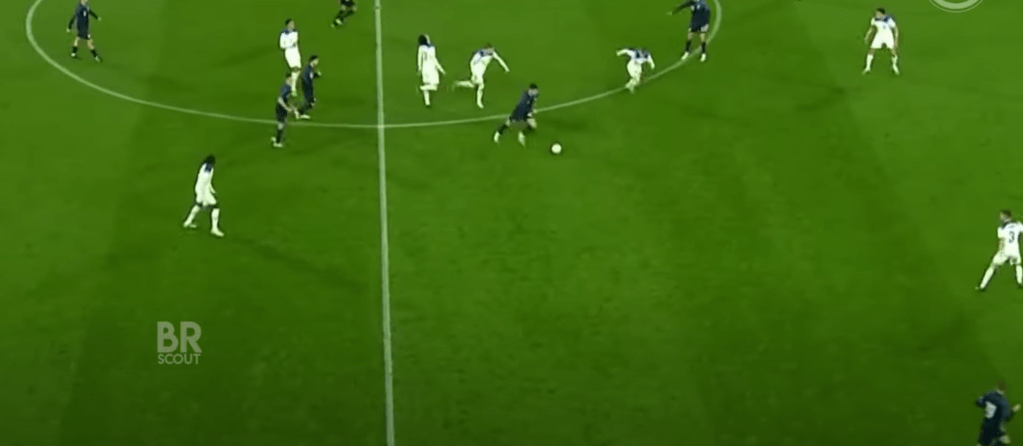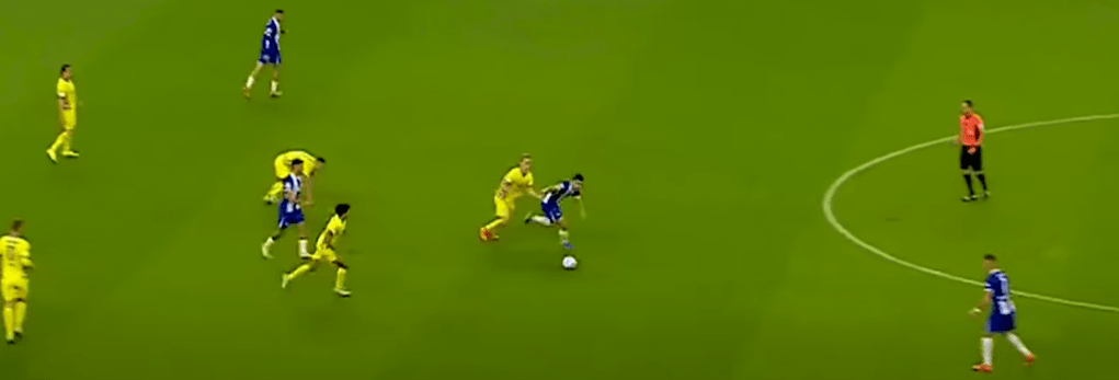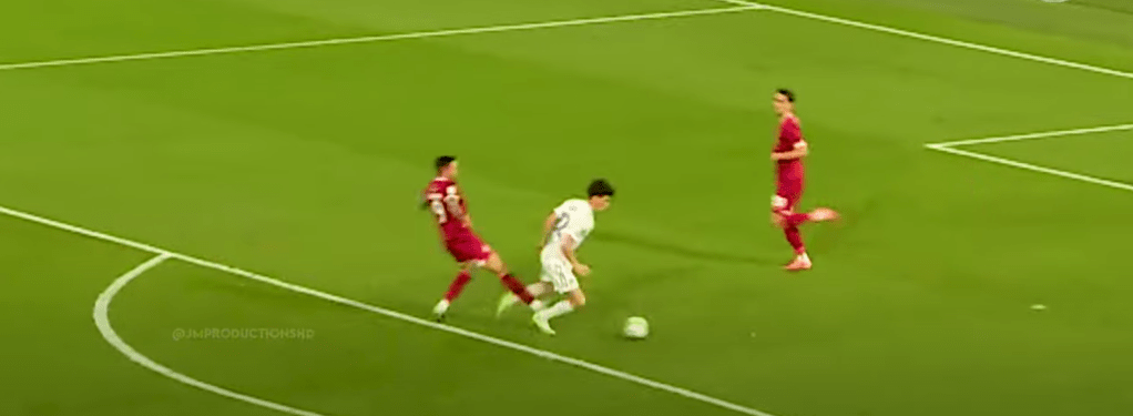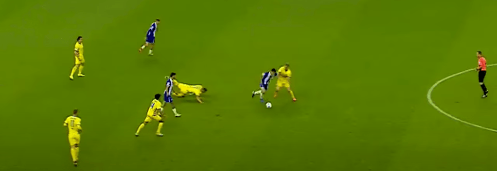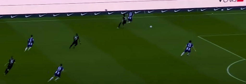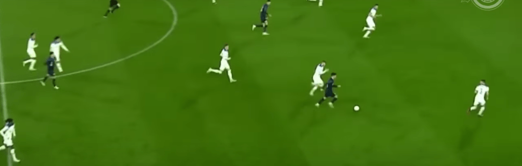 Now, look how the opponent’s high press is carved open by the Spaniard’s willingness and quality to pick up the ball centrally and drive his team into the attacking third, and as a result, he has three attacking teammates to pick out with a clear route to goal…