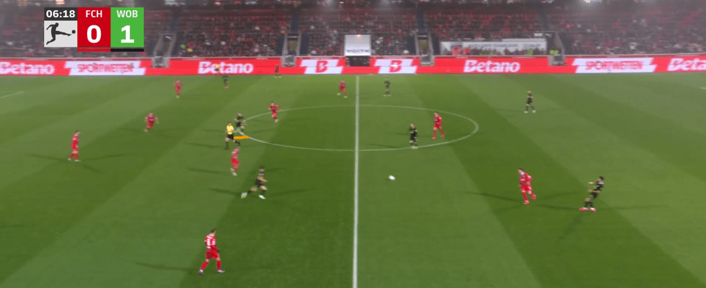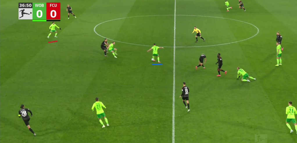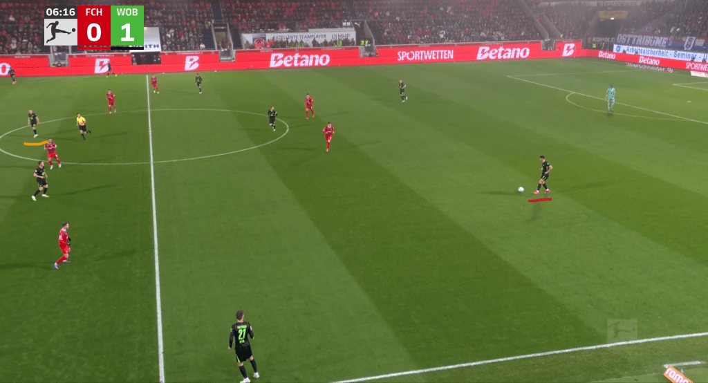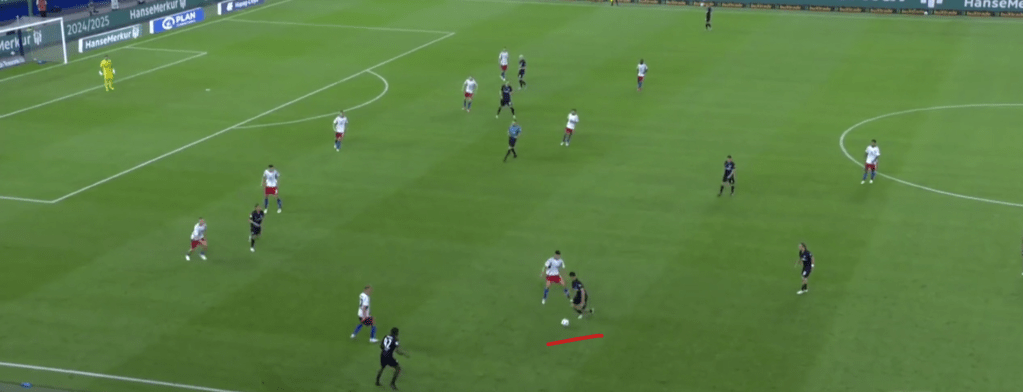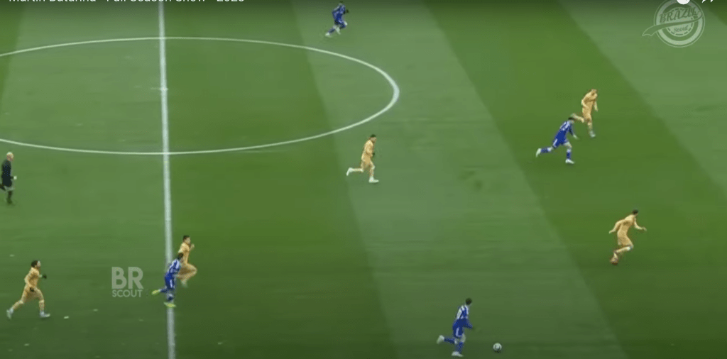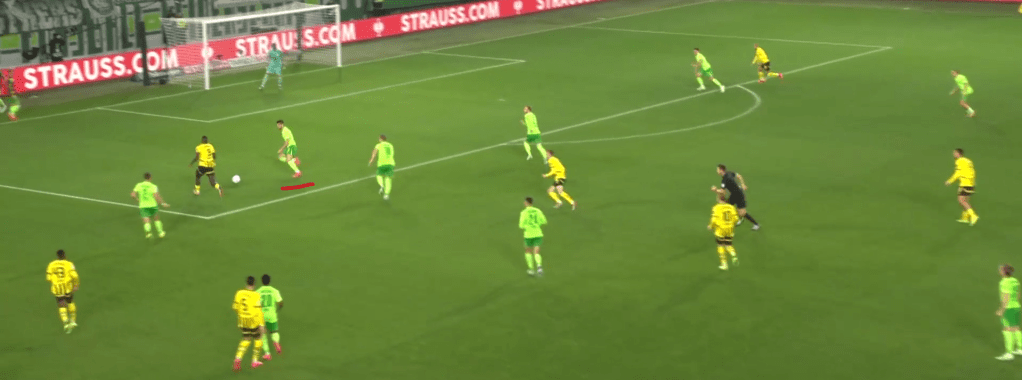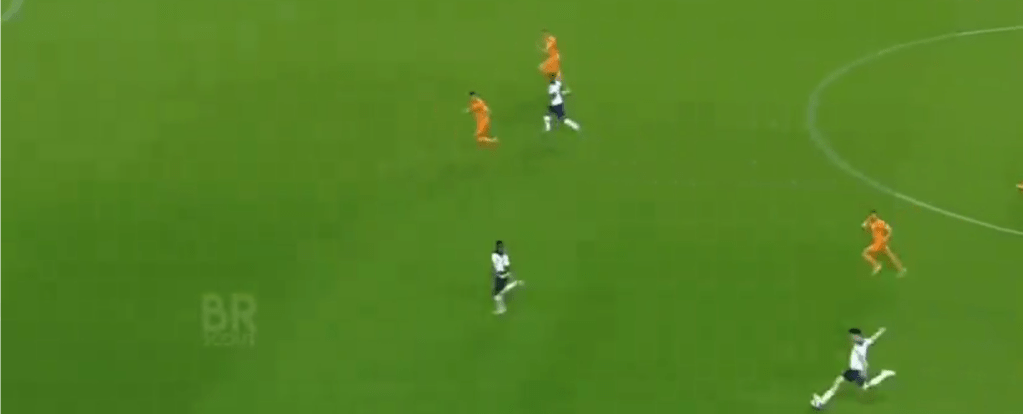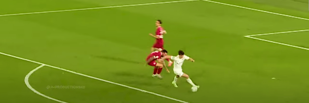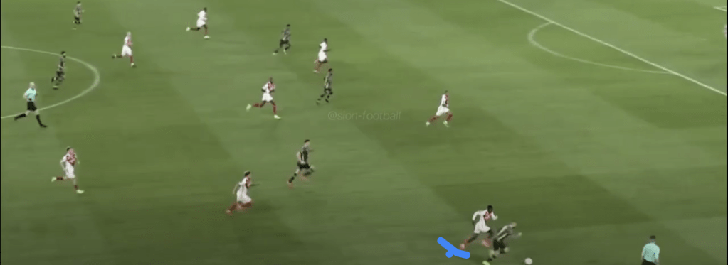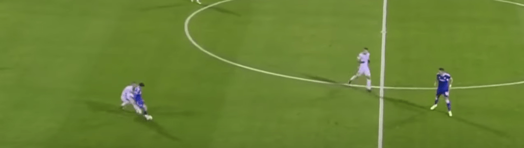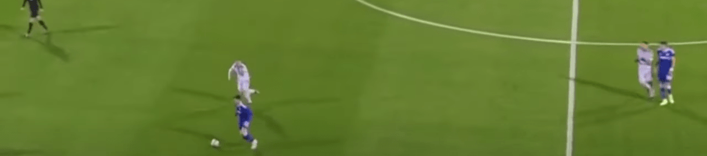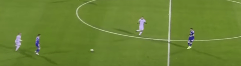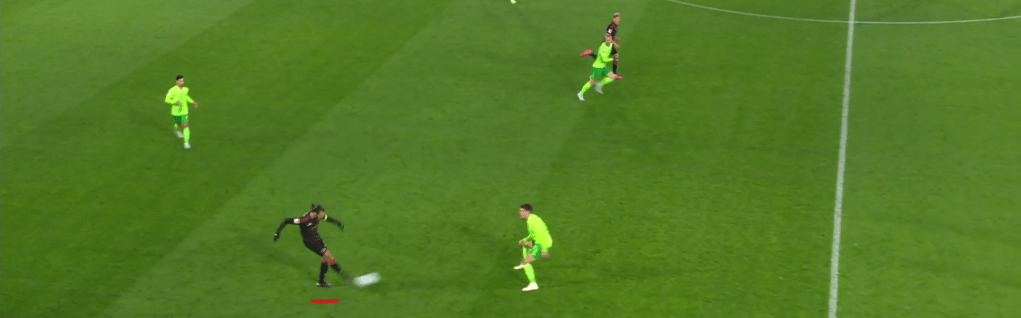 In another instance from the 2024/25 campaign last year, the 20-year-old picks up the ball in transition in between the opponent’s midfield and a dissected defensive line, with a full view of what’s ahead and the different avenues to goal…