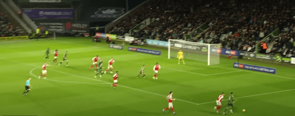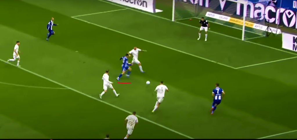 With Igamane, who is an out-and-out #9, on the pitch at this moment in the match, Fernandez-Pardo is played as the second front man in a 4-4-2. His movement beyond the former Rangers man and exploiting the gaps in the opposition defence is excellent.