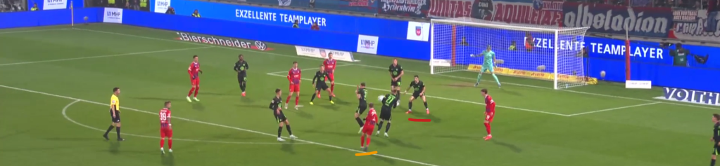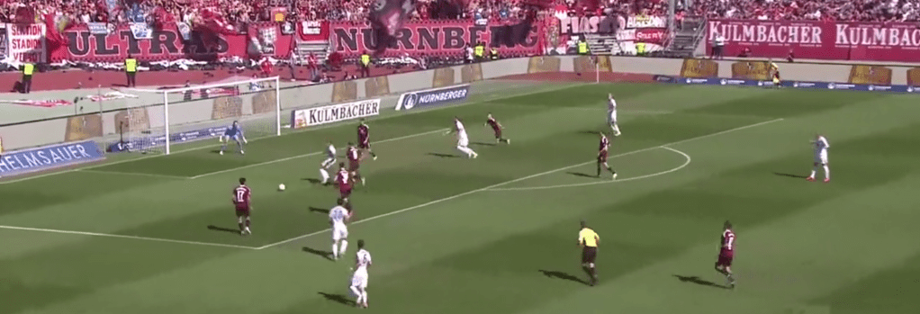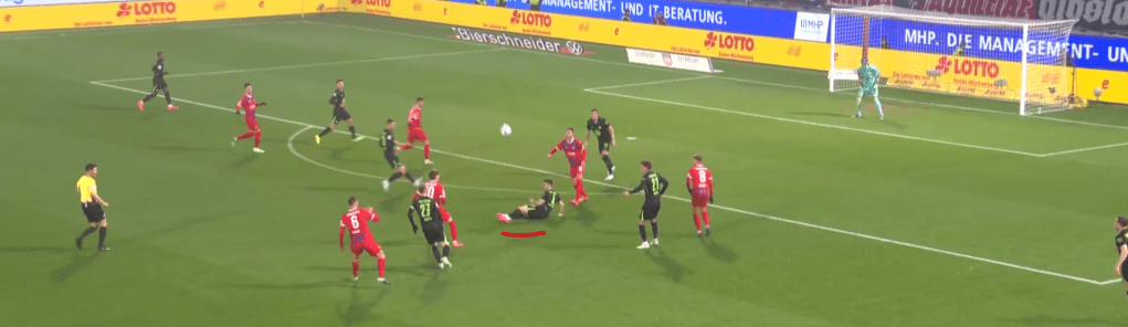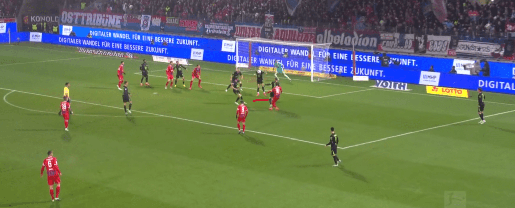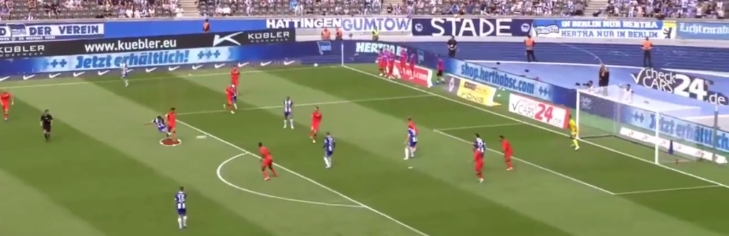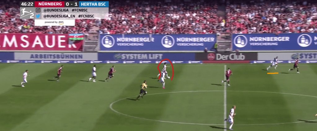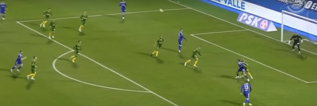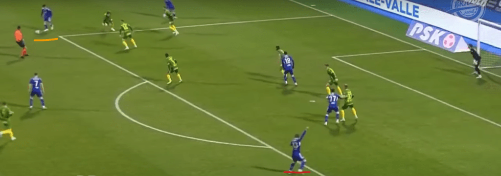 Another fine example of his excellent #9 mentality when called upon is not only in his dropping deep and linking the play, or helping his side get out of pressure when he drops, but he’s also capable of stretching the defence through well-timed last line movement and runs.