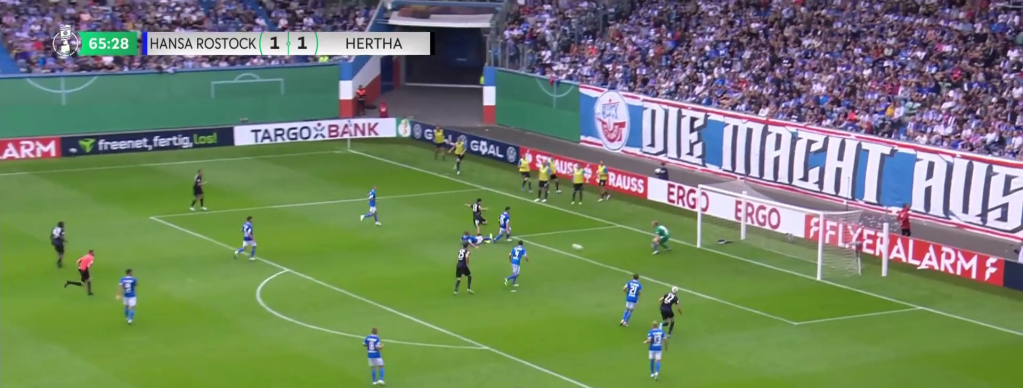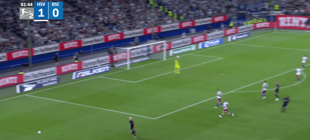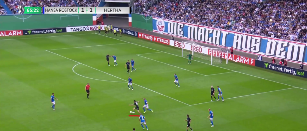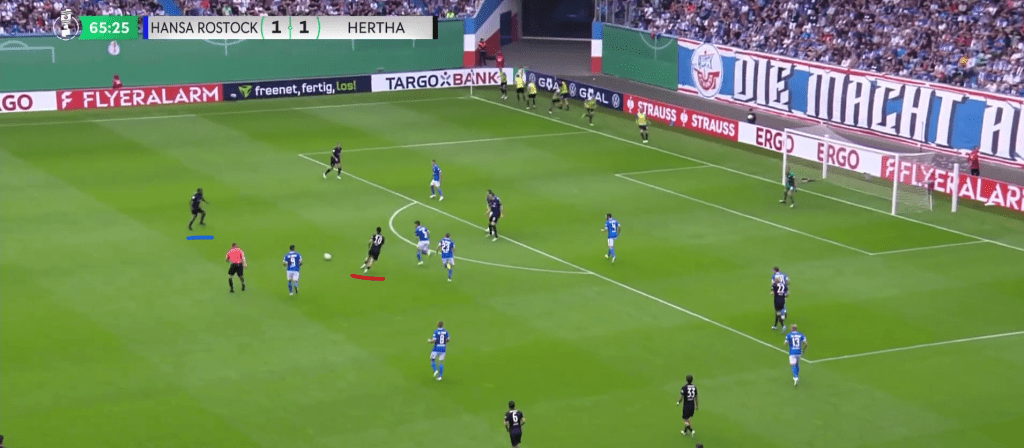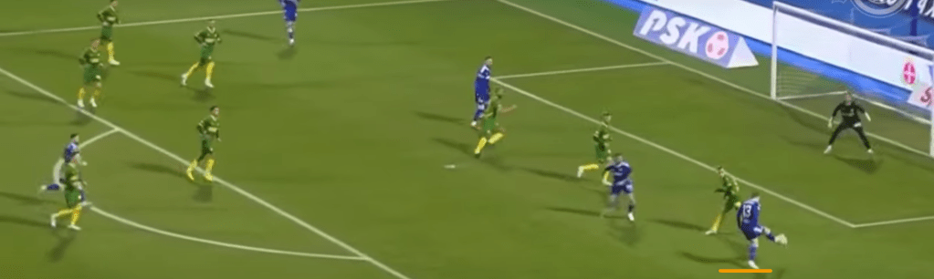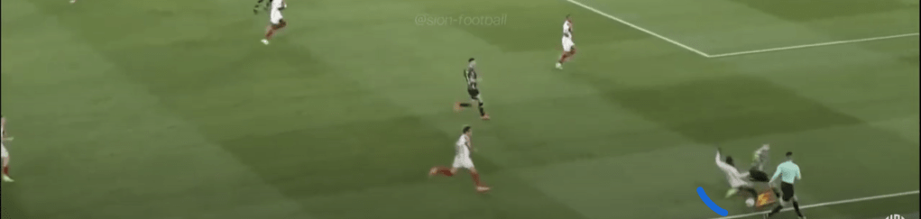 That doesn’t matter to him one bit. He completely takes them all out of the game with one sensational flick with his right boot into the path of Jonathan David (BLUE), who has a clear route and shot at goal.