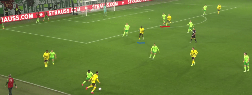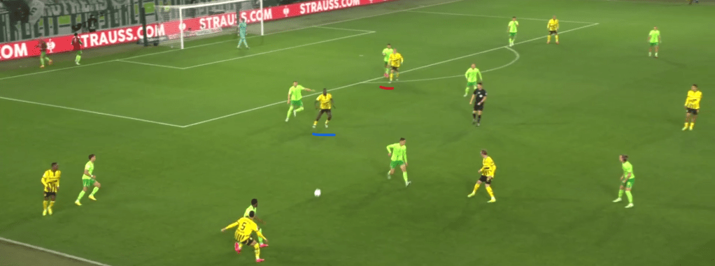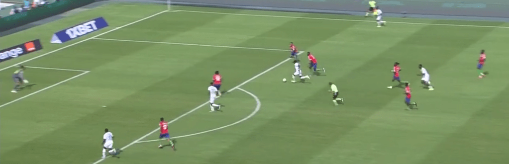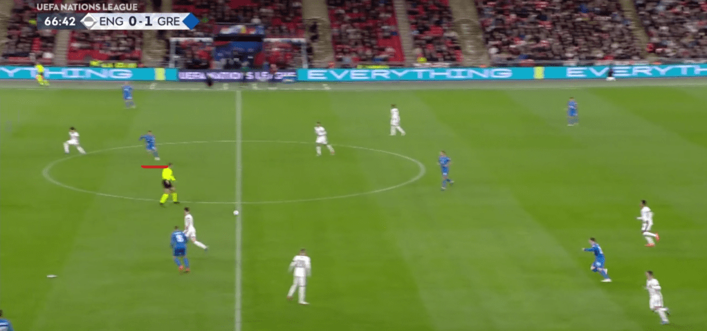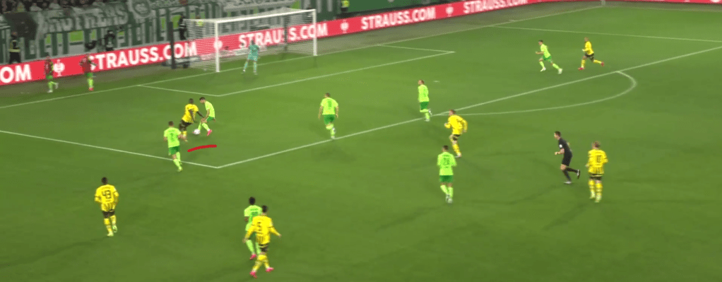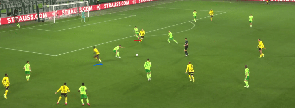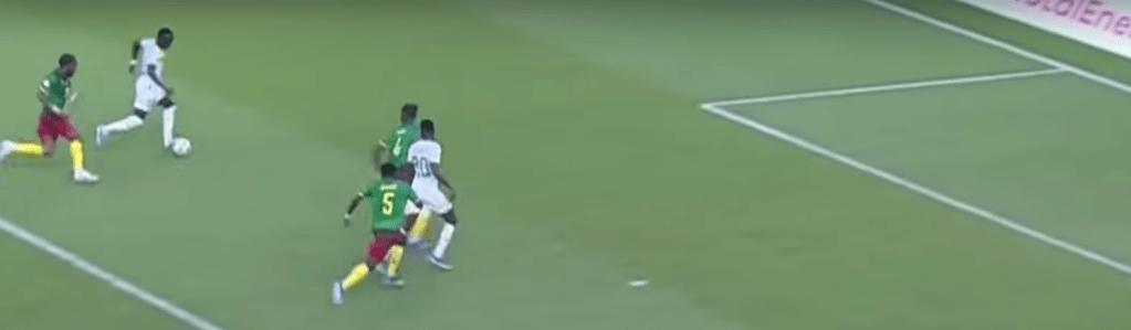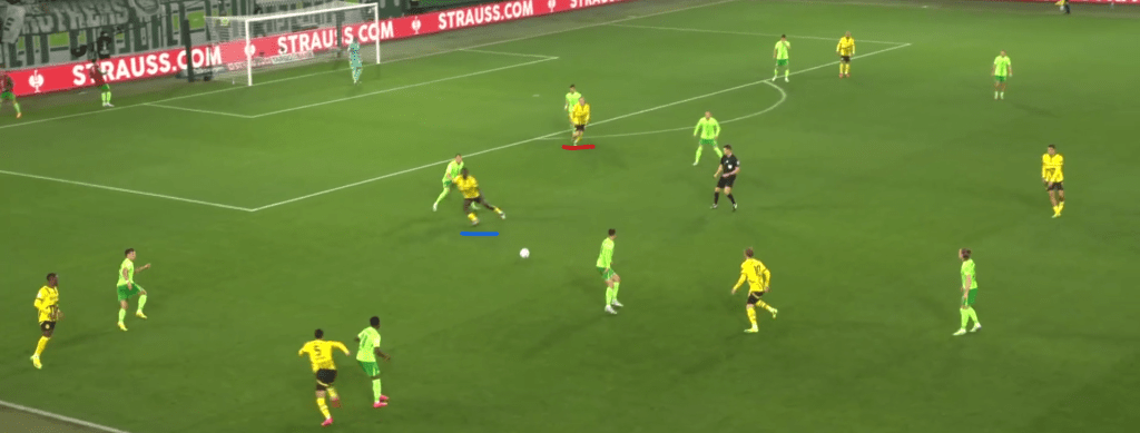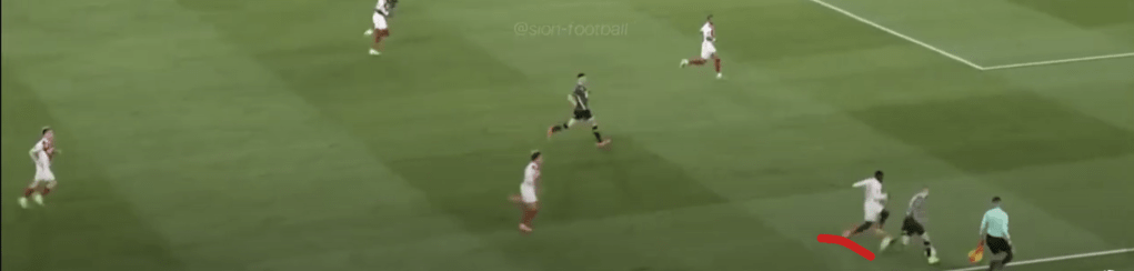 In another instance, the young winger is provided the ball wide left with an oncoming defender ready to press him the moment he receives it.