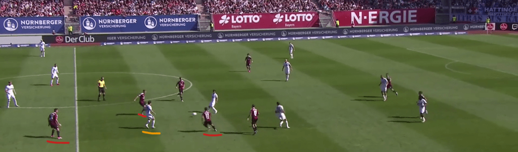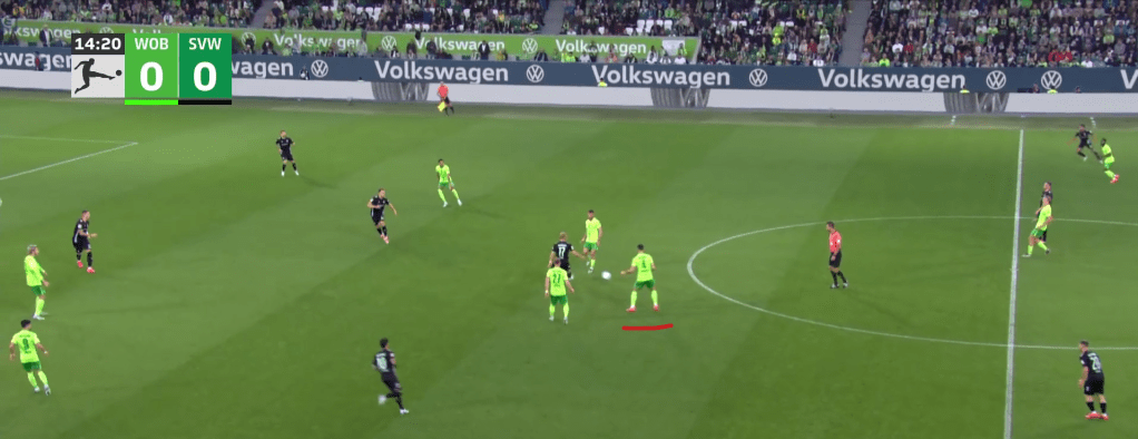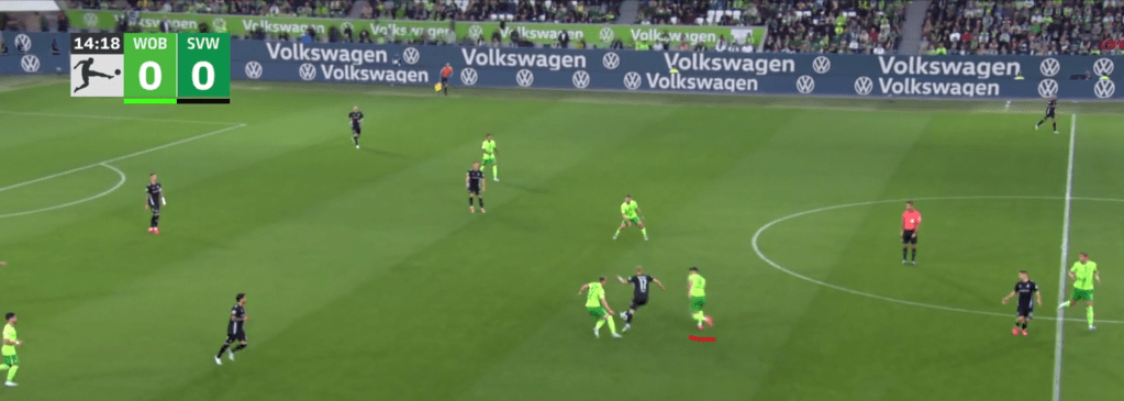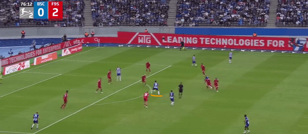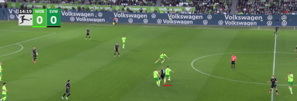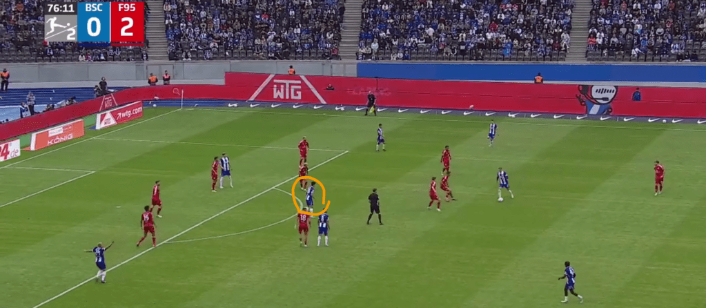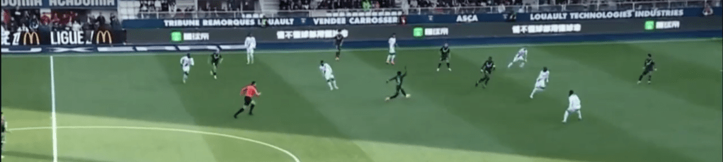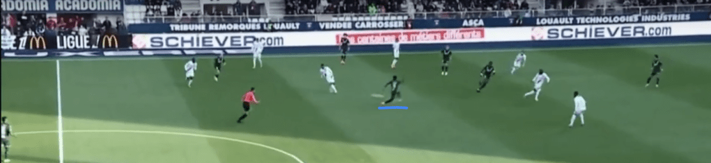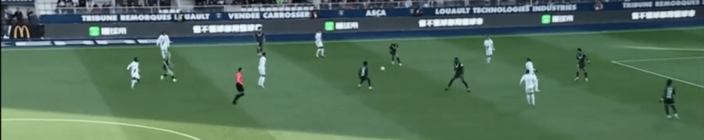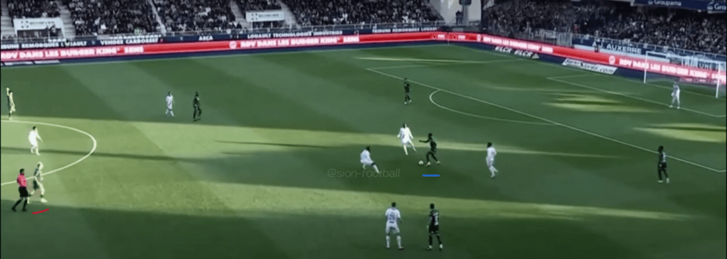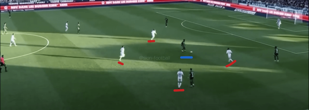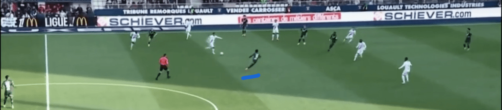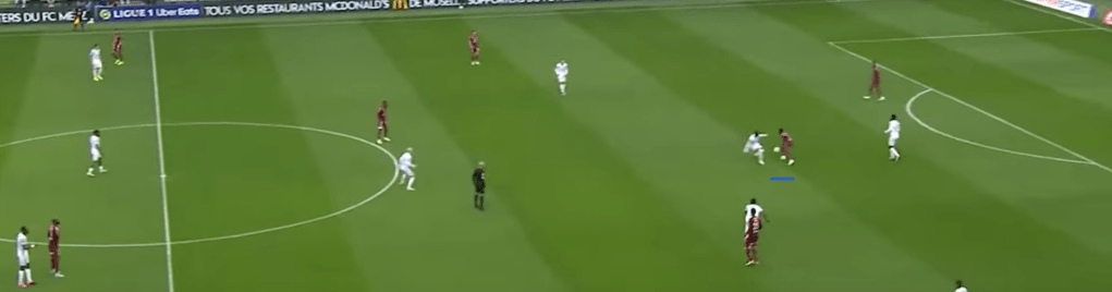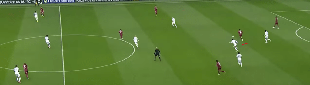 In the example below, he picks up the ball deep in his own half as Lille tries to play their way out of OGC Nice’s pressure, desperately needing an outlet to take the ball despite the press and evade it.