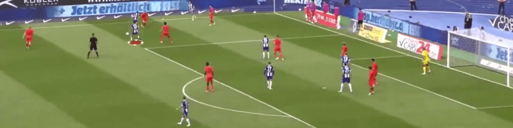 In another example, below, we see him take up a central position, pinning the centre-backs back into their penalty box,