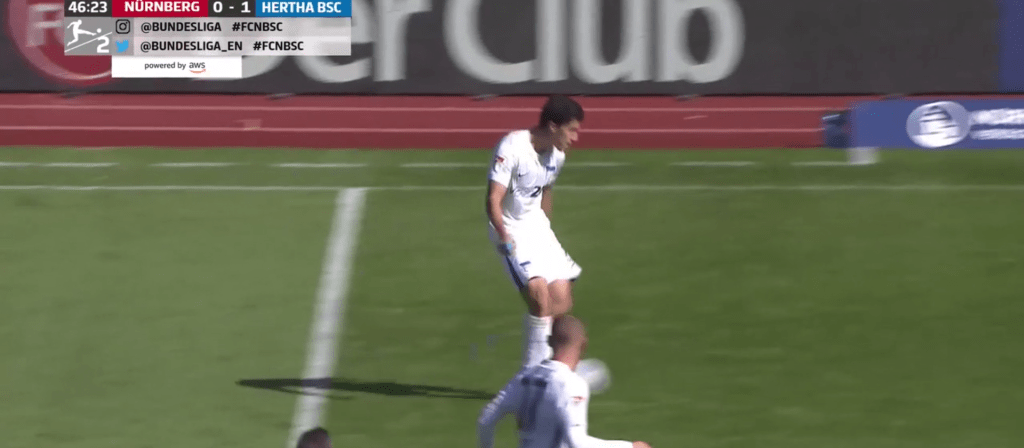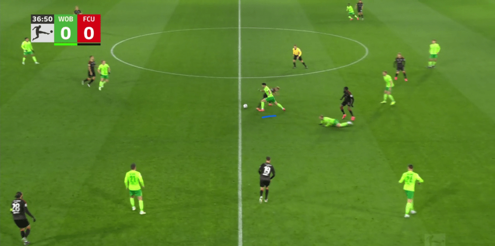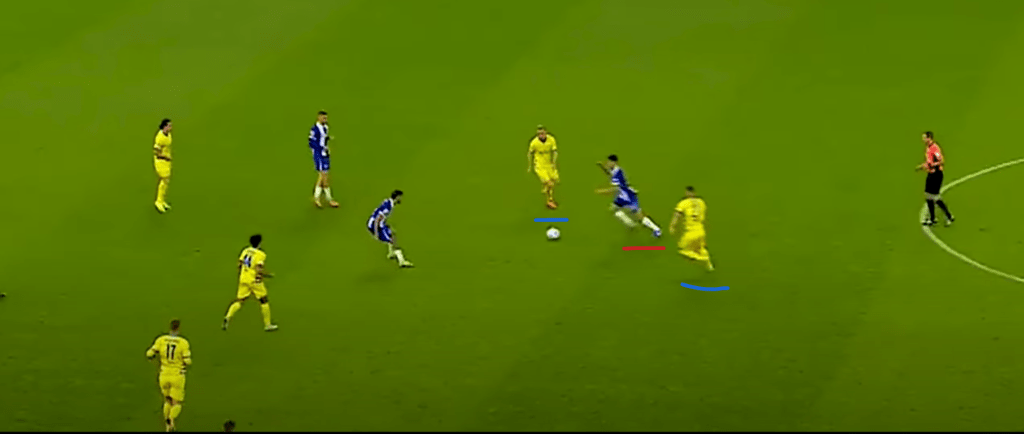 Below, he stands up against his opponent in that elusive stop-start operation he so wonderfully executes in 1v1s. He reels the defender in, who thinks he has the winger caged in and going nowhere; in fact, his positioning is quite decent.