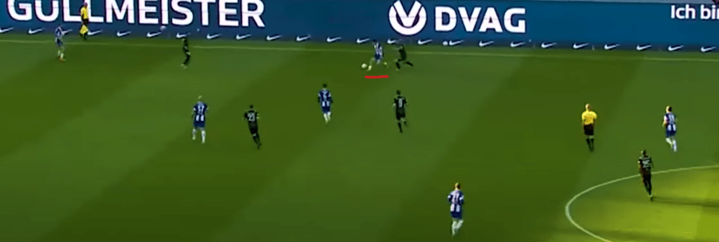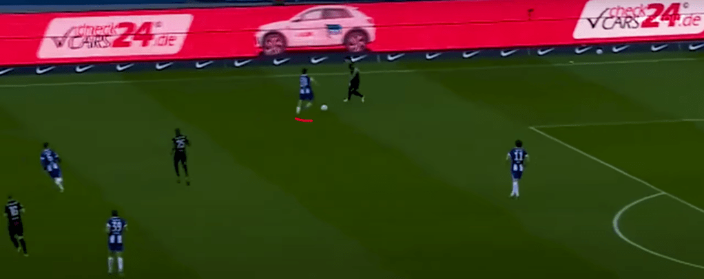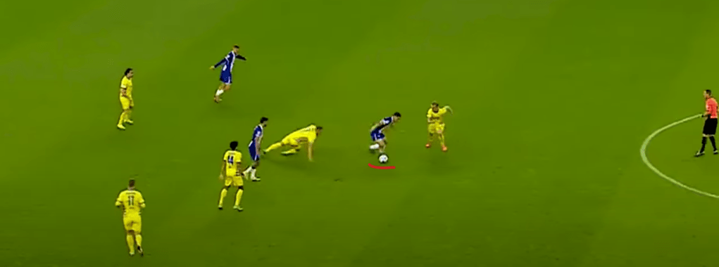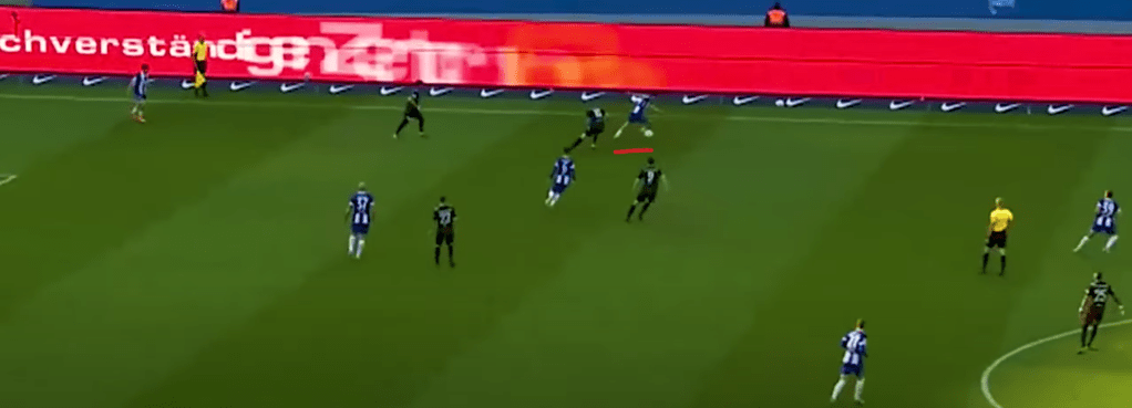 As shown in the clip above, the Brussels-born forward receives the ball high and wide, standing up against the opponent’s full-back.