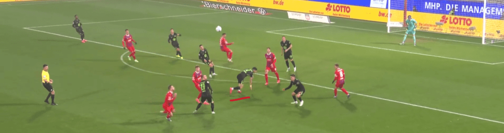 The first of his two goals, the Spaniard has peeled off the back line, looking to get involved with the play. When the ball is won in the air by Igamane, Felix Correia takes advantage of a slack Lorient defence, with Fernandez-Pardo already on the move on the far side…