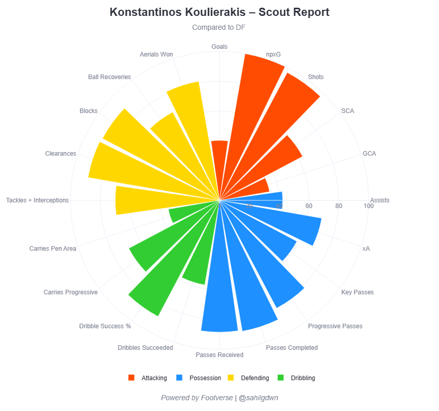 His performance is equally concerning in the middle third, where he ranks in the 18th percentile for tackles. Disturbingly, he falls to the bottom 5th percentile among wingers for both tackles and interceptions, painting a picture of a player who is often disengaged from the defensive effort.