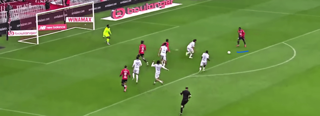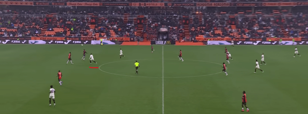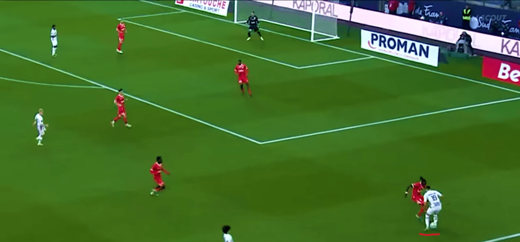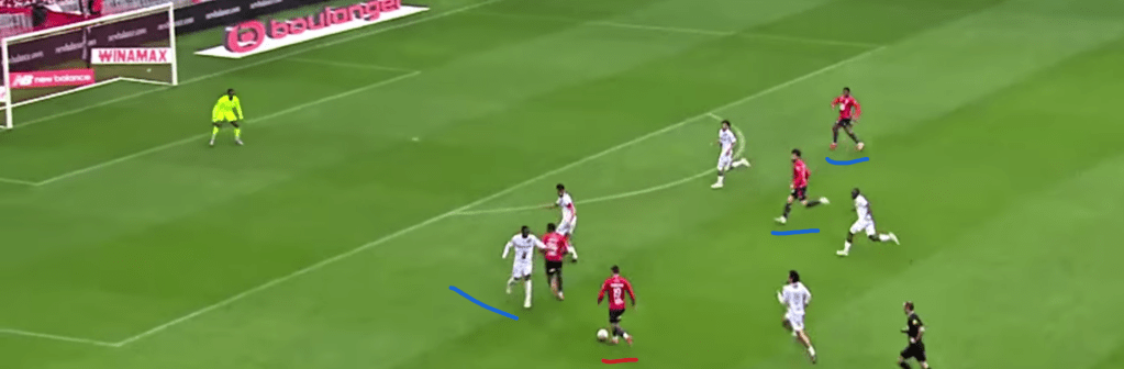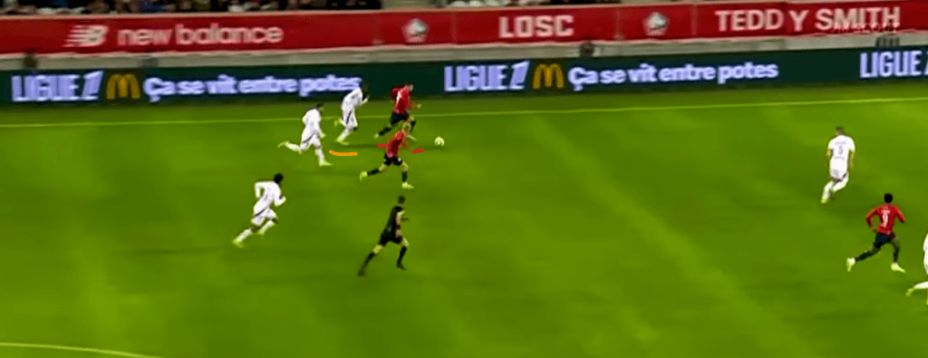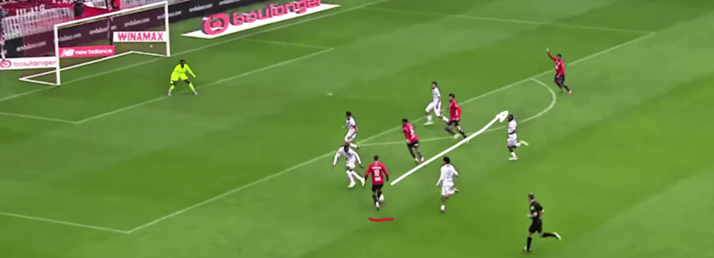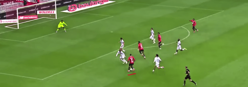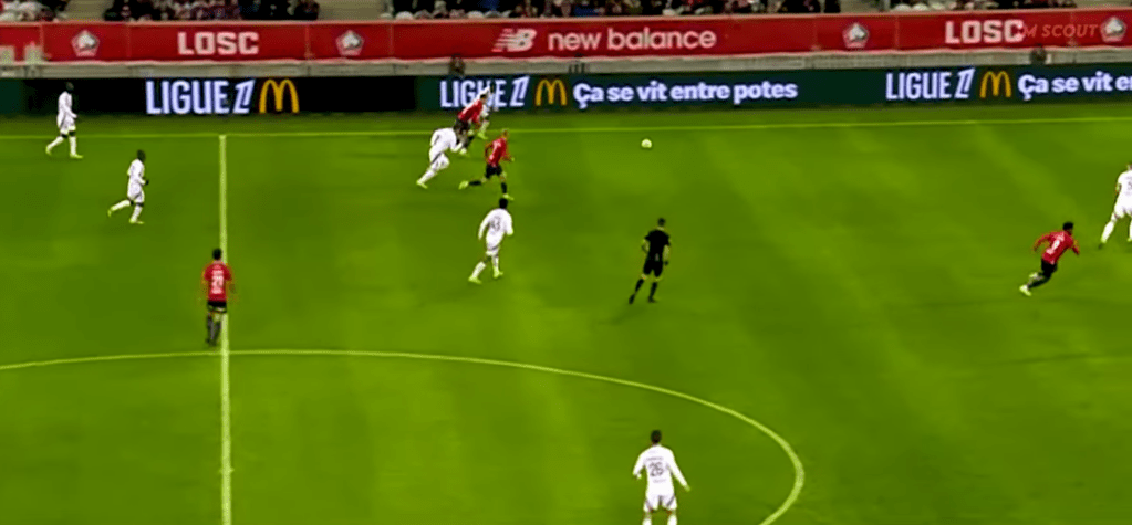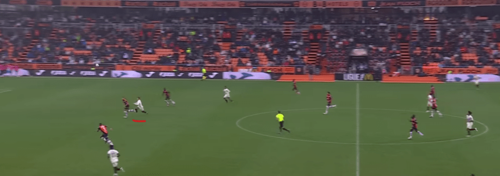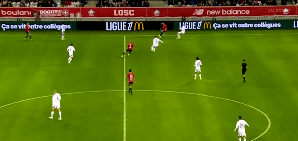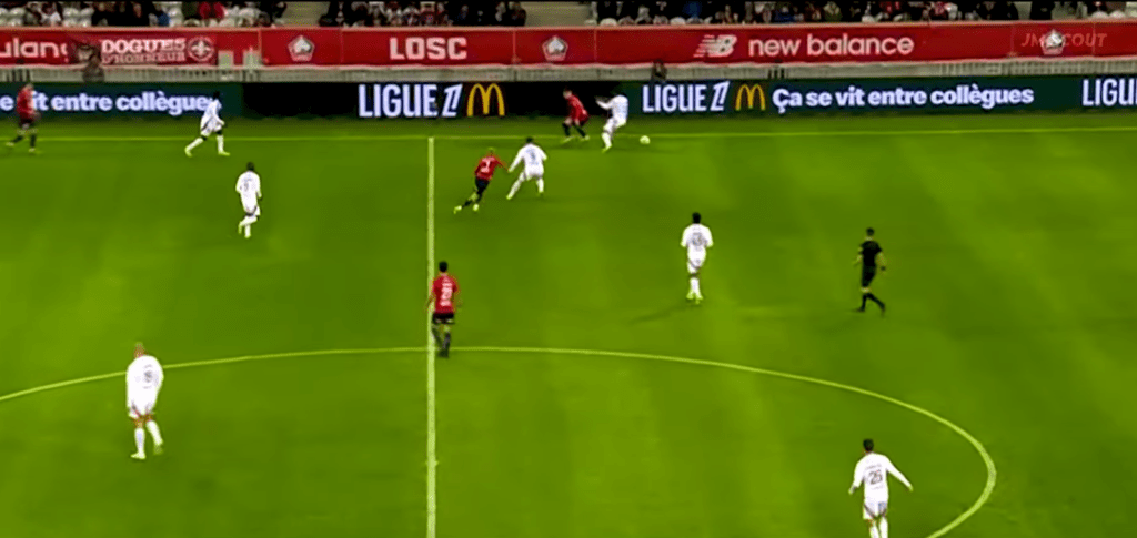 In the example below, he picks up the ball deep in his own half as Lille tries to play their way out of OGC Nice’s pressure, desperately needing an outlet to take the ball despite the press and evade it.