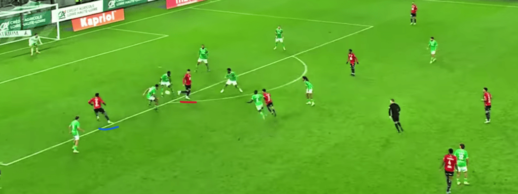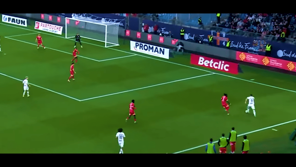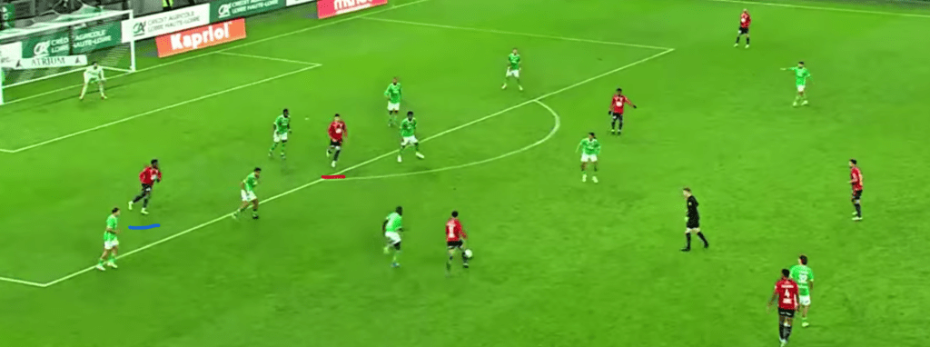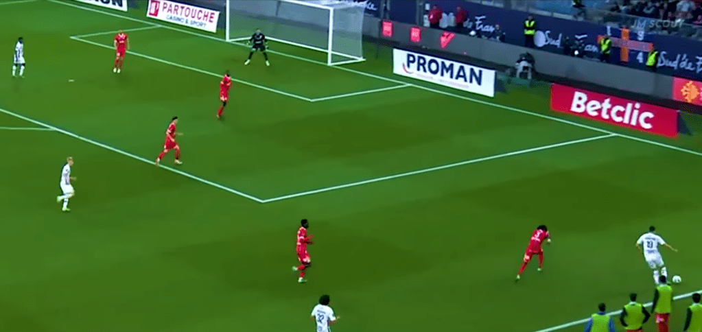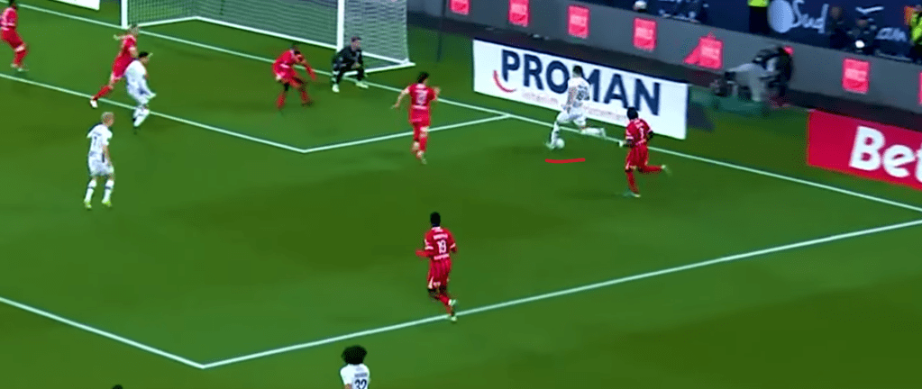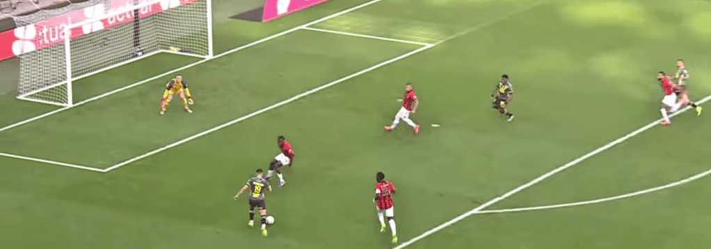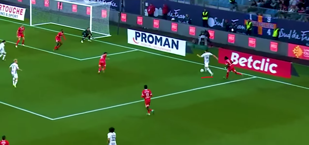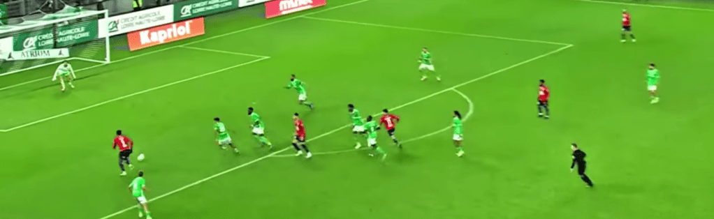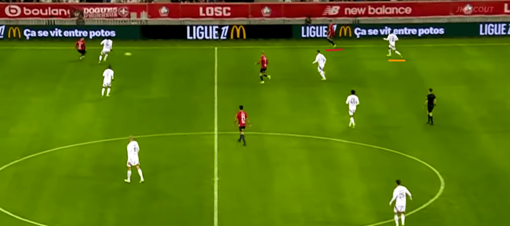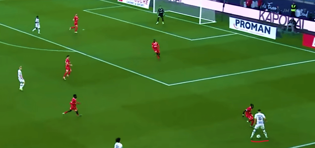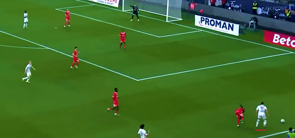 In the example below, he picks up the ball deep in his own half as Lille tries to play their way out of OGC Nice’s pressure, desperately needing an outlet to take the ball despite the press and evade it.