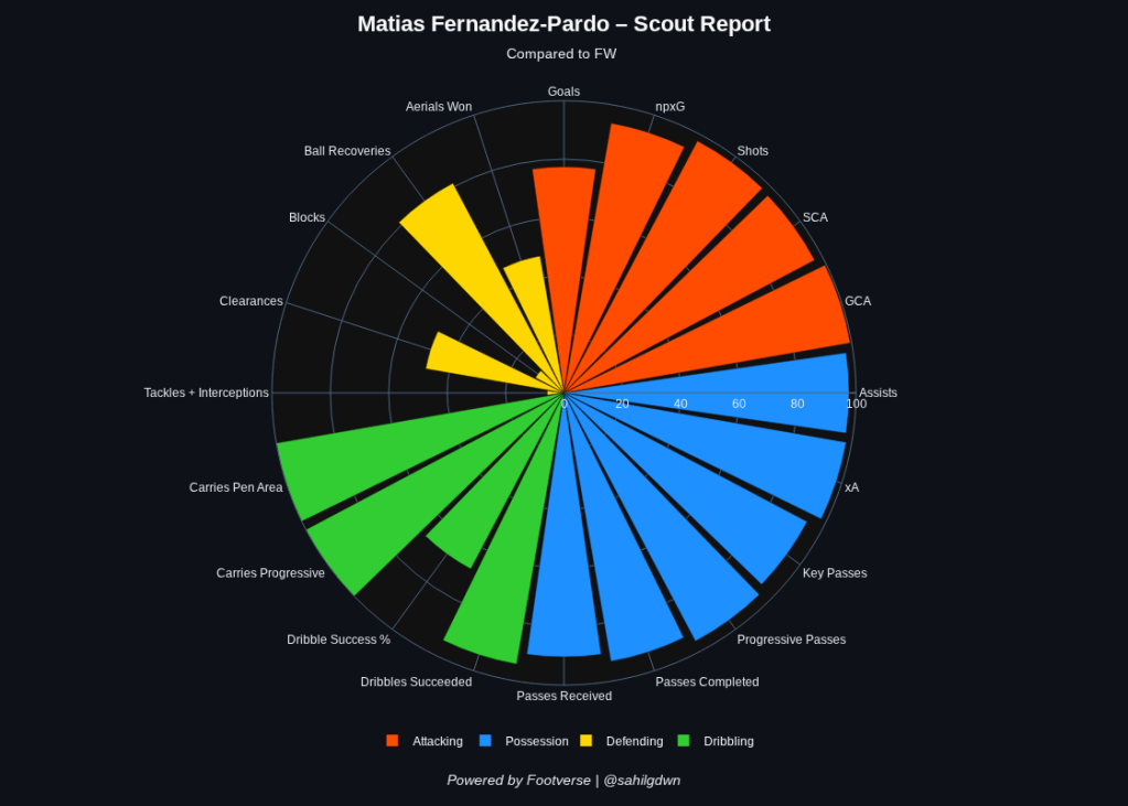 Through these various metrics, you can almost paint a picture of what kind of attacker Fernandez-Pardo is.