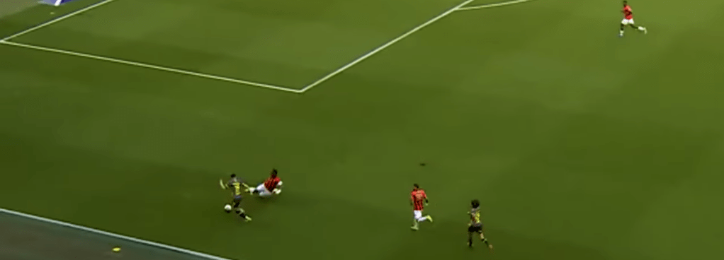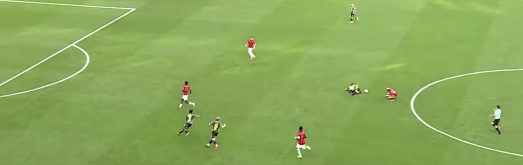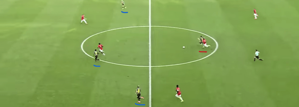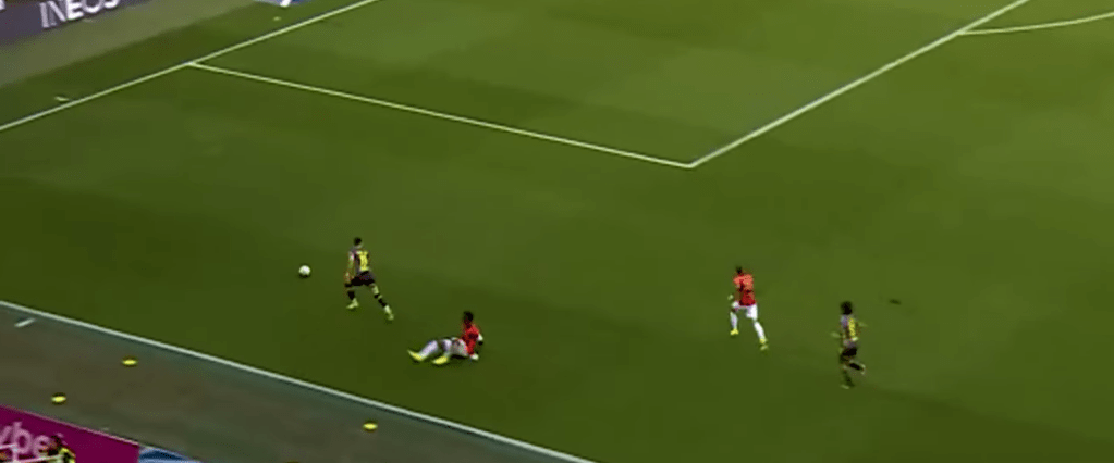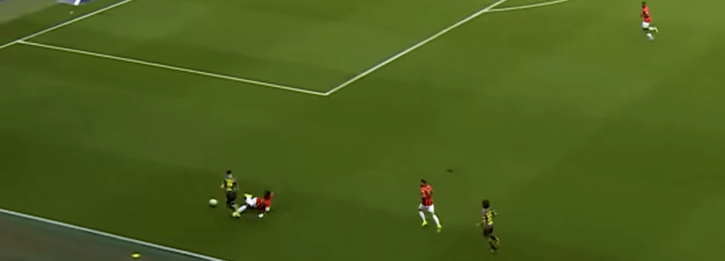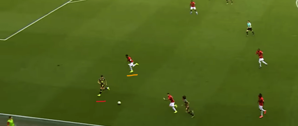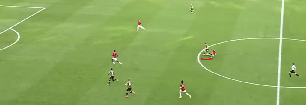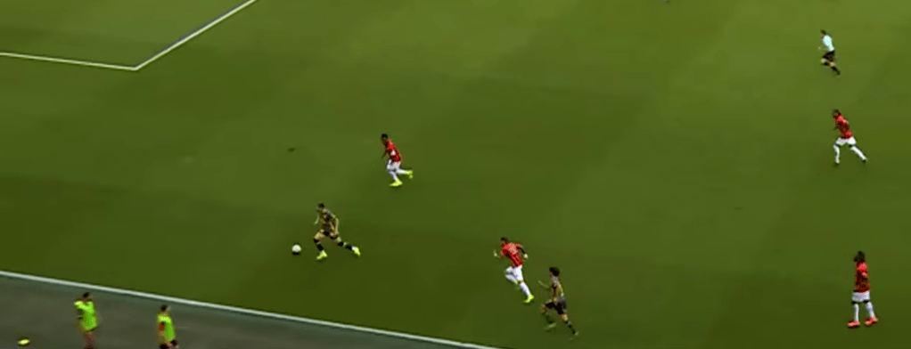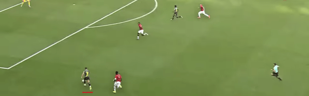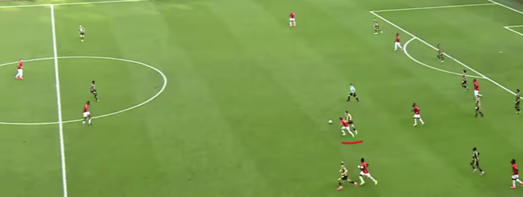 In another instance, the young winger is provided the ball wide left with an oncoming defender ready to press him the moment he receives it.