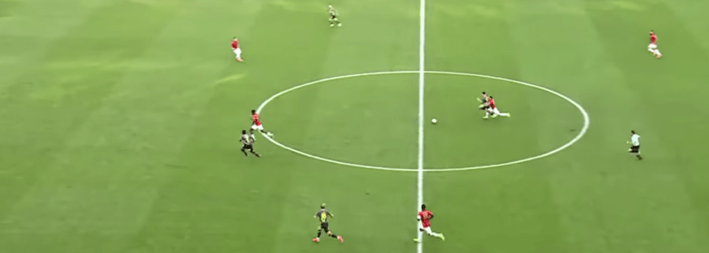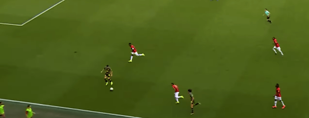 Now, look how the opponent’s high press is carved open by the Spaniard’s willingness and quality to pick up the ball centrally and drive his team into the attacking third, and as a result, he has three attacking teammates to pick out with a clear route to goal…