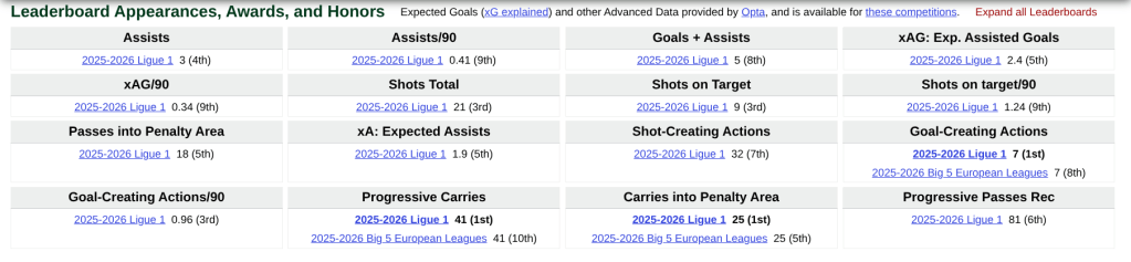 In Ligue 1 this season, at the time of writing, he ranks 1st out of all players in the French top flight for goal-creating actions (7), first for progressive carries (41), first for carries into the penalty area (25) and fifth for passes into the penalty area (18) (FBRef).