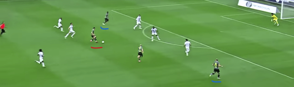 For instance, in the image below, we see Fernandez-Pardo picking up the ball wide, but in a pretty awkward position, with his back to goal and the angle to beat his marker looking extremely difficult…