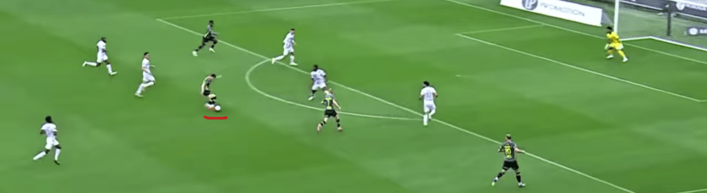 In another instance from the 2024/25 campaign last year, the 20-year-old picks up the ball in transition in between the opponent’s midfield and a dissected defensive line, with a full view of what’s ahead and the different avenues to goal…