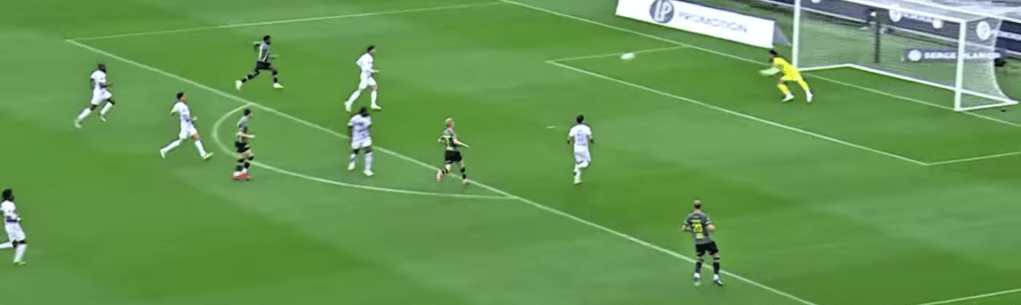 But the Canadian striker surprisingly scuffs his opportunity. However, it’s another fine example of Fernandez-Pardo’s extraordinary imagination, awareness and creativity despite the tight situation.