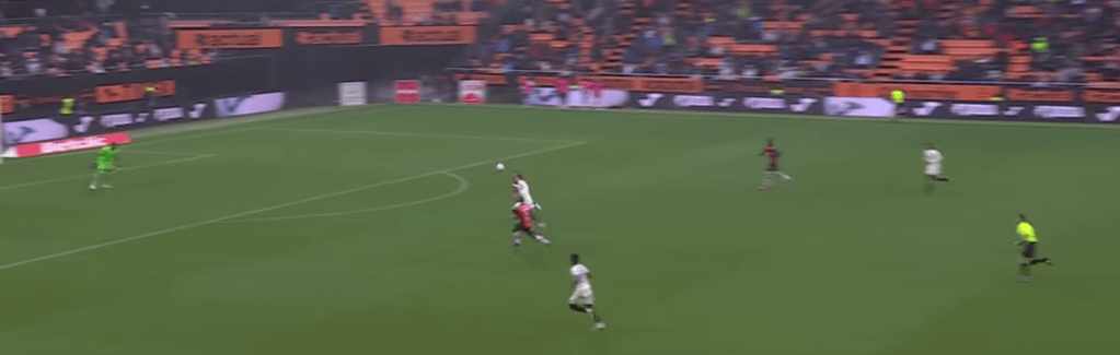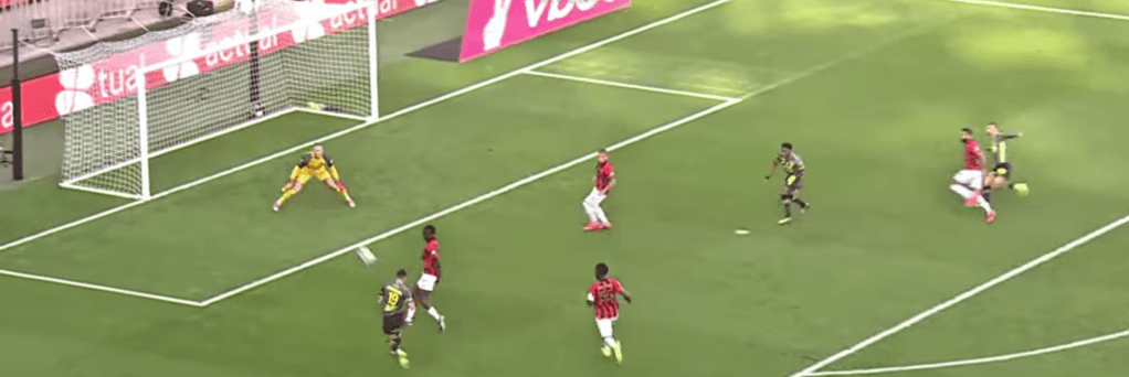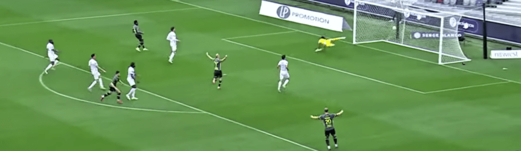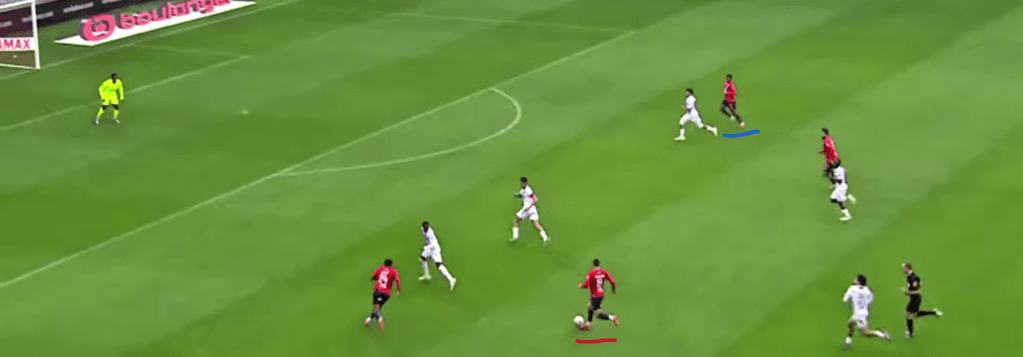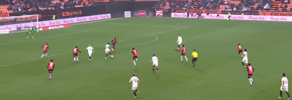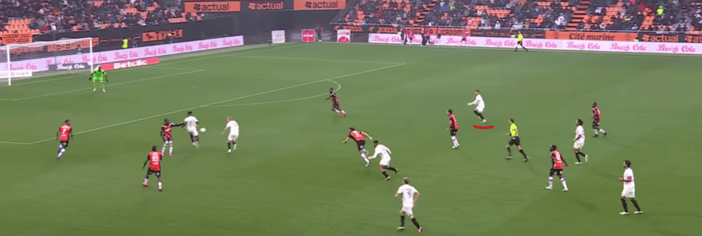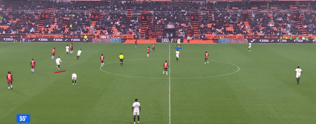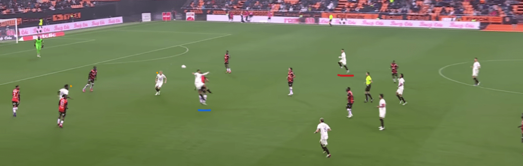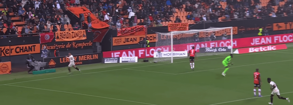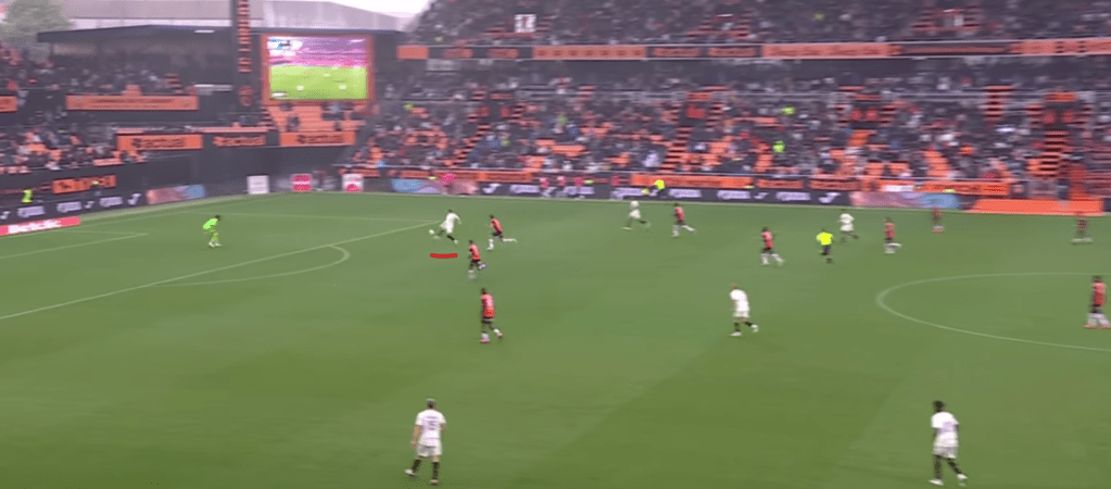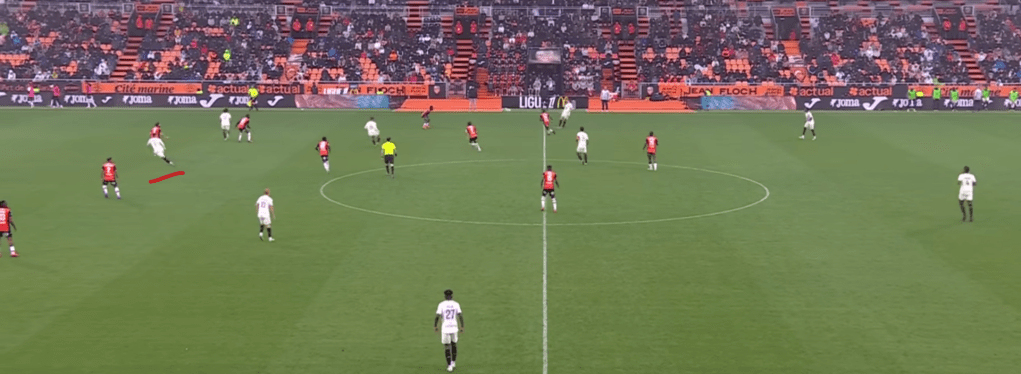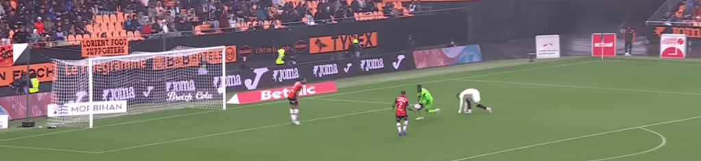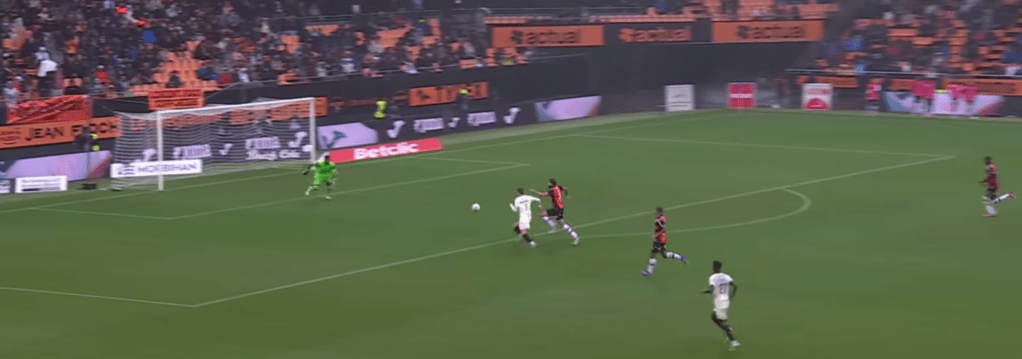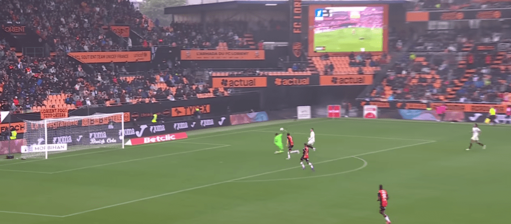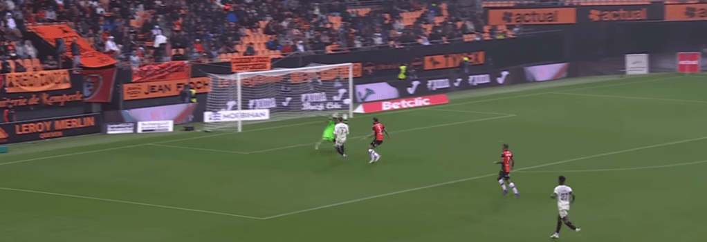 The first of his two goals, the Spaniard has peeled off the back line, looking to get involved with the play. When the ball is won in the air by Igamane, Felix Correia takes advantage of a slack Lorient defence, with Fernandez-Pardo already on the move on the far side…