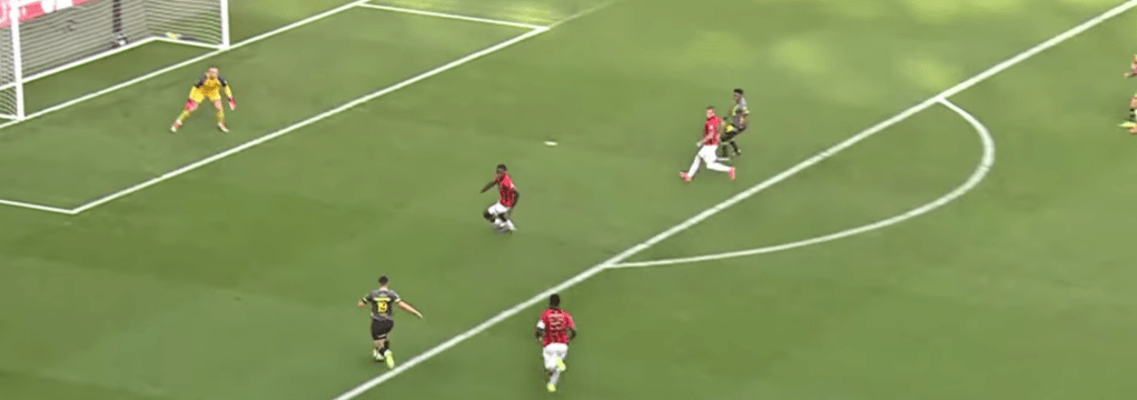 He bursts into the box, and if you look closely at his unique dribbling style with an upright stature, he’s confident, assured and sees the whole picture ahead while reaching a reasonable speed before picking out striker Hamza Igamane with a terrific cut-back who finishes low into the bottom corner.