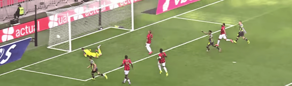 That doesn’t matter to him one bit. He completely takes them all out of the game with one sensational flick with his right boot into the path of Jonathan David (BLUE), who has a clear route and shot at goal.