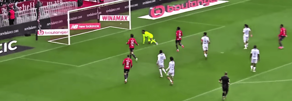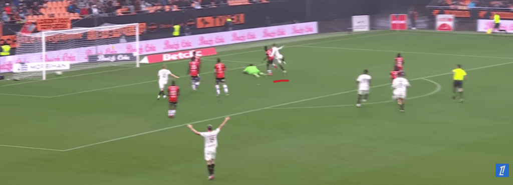 Here, Lille goalkeeper Berke Özer delivers a long ball, hoping to find one of his attacking teammates. The first to engage is an FC Lorient defender, who inadvertently attempts to head back to a teammate behind him but completely misjudges the situation, as his defensive line is so high that it presents an opportunity for Fernandez-Pardo to take advantage…